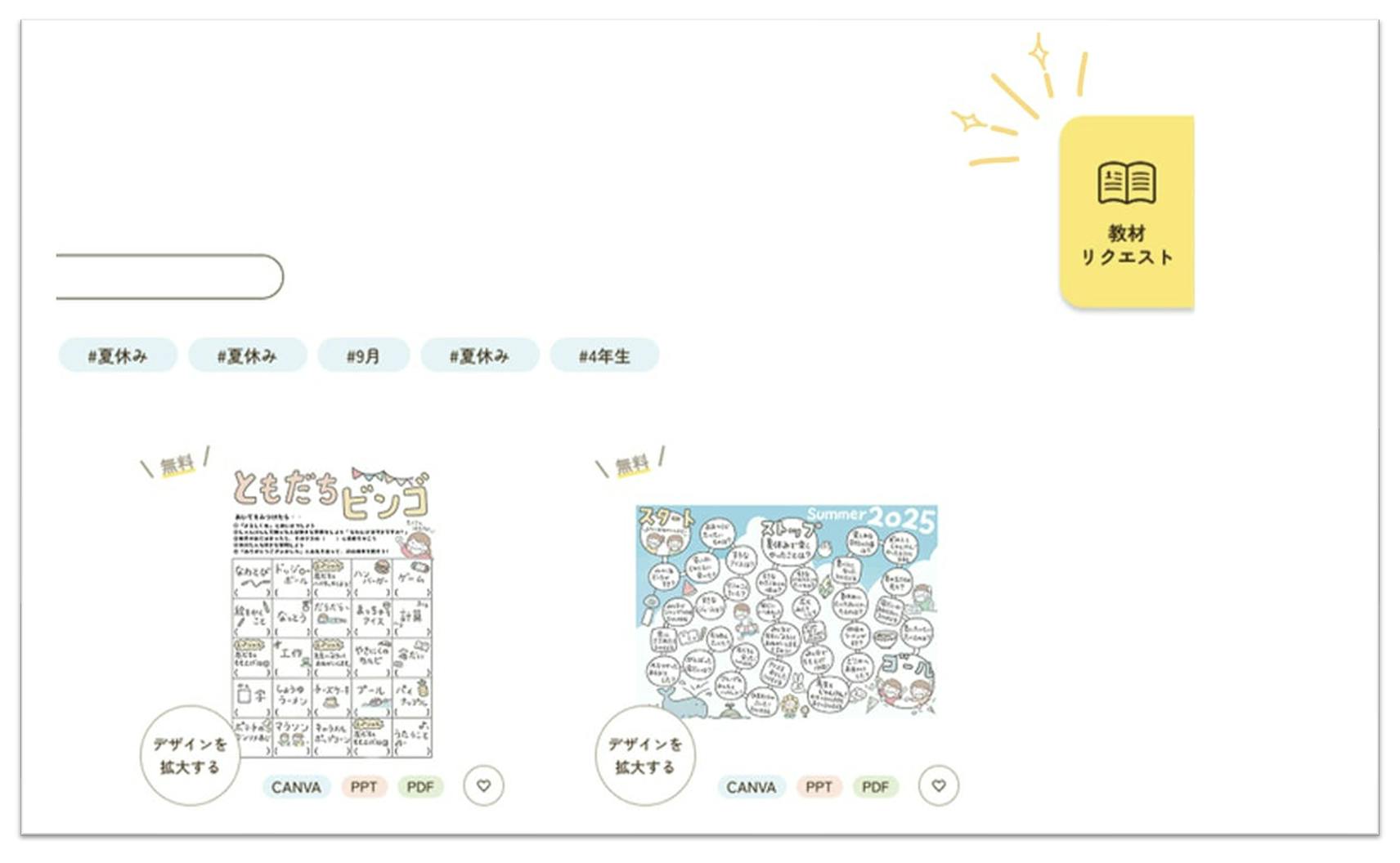 教材一覧ページには〝教材リクエストボタン〟があります。「こうだったらもっと使いやすい」という声が新しい教材のヒントになり、現場とつながりながら、一緒に作っていく“参加型の教材サイト”を目指しています。