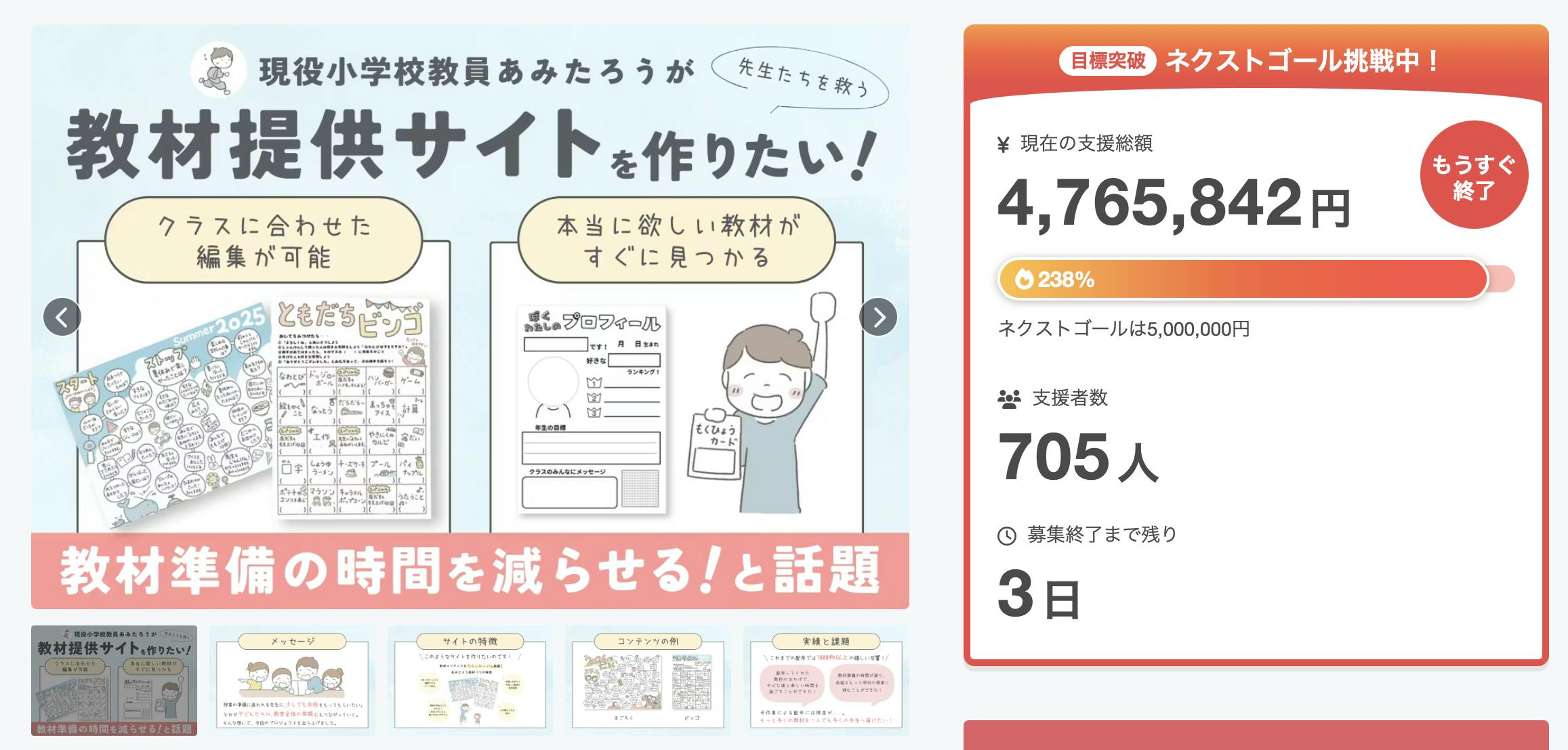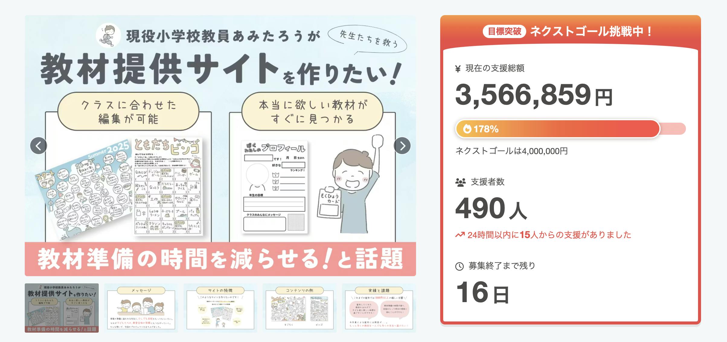 2026/01/31 20:10こんにちは、あみたろうです。クラウドファンティングを始めてから2週間が経ちました。2週間で350万円の支援が集まり、感謝の気持ちでいっぱいです。最終目標まで残り50万円ほどです。まずは、クラウドファンティング終了まで全力で走り抜けます!先生を助けるためのサイトを1人でも多くの皆さんと共に育てていけたらと思います!引き続き、応援よろしくお願いいたします! もっと見る