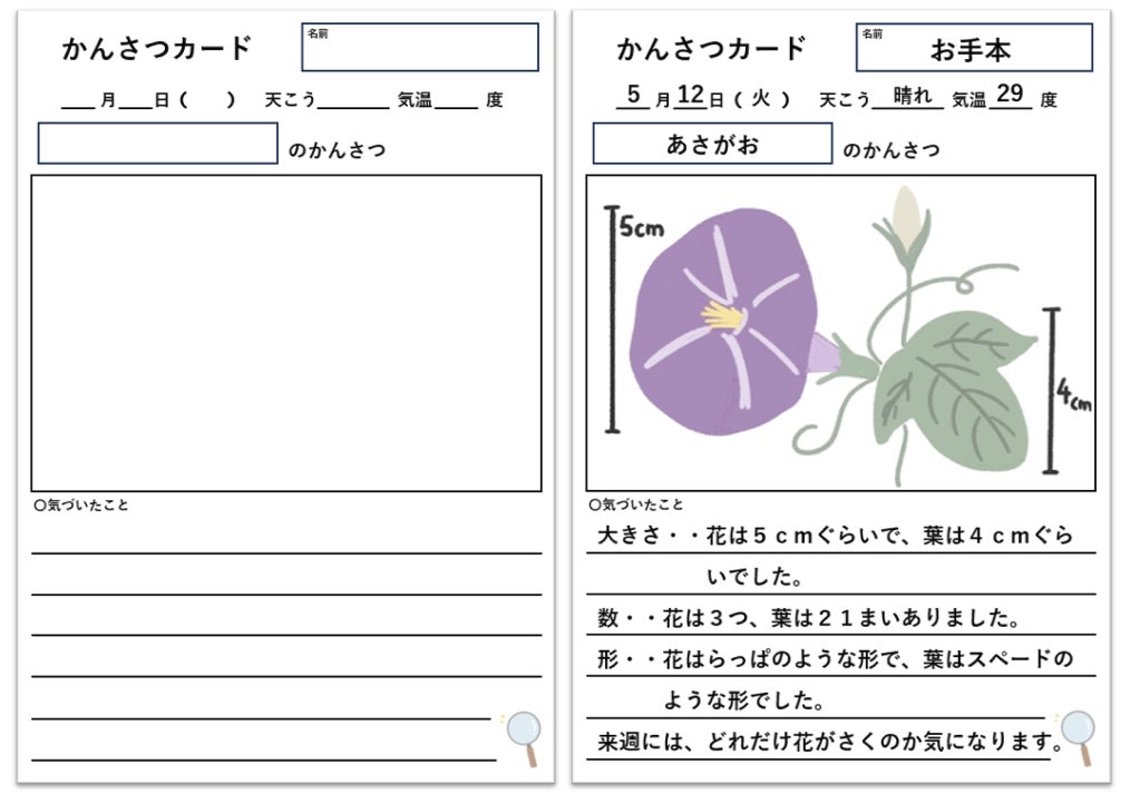 観察カードは、児童のスケッチの邪魔にならないようにあえてシンプルに。その分、指導しやすい編集できるお手本付き。
