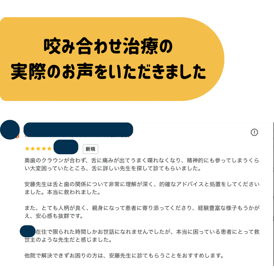 2026/03/23 16:13いつもご支援ありがとうございます。安藤歯科クリニック 安藤です。本日は、実際に咬み合わせ治療を受けられた患者様からのお声をご紹介させていただきます。(※個人が特定されないよう一部加工しております)今回の患者様は、奥歯のクラウンが合わず、舌に痛みが出てしまい、うまく話すことも難しくなるほどお困りの状態でした。一般的には「歯」や「舌」は別々に考えられることが多いのですが、実際の臨床の現場では、噛み合わせと舌の関係が深く影響しているケースが少なくありません。このように、原因が分からず長く悩まれている不調の中には、口の中の状態が関係している可能性があります。私たちはこれまで30年以上にわたり、咬み合わせと全身の関係に向き合ってきました。そして今回、こうした臨床の実感を「感覚」ではなく、エビデンスとして証明するための研究に取り組んでいます。一人でも多くの方が、原因不明の不調から解放される未来を目指して。引き続き、現場のリアルな声をお届けしてまいりますので、どうぞ応援のほどよろしくお願いいたします。そして今回このような口コミを書いていただいた患者様にこちらでも感謝の思いを伝えます。ありがとうございました。安藤 もっと見る
