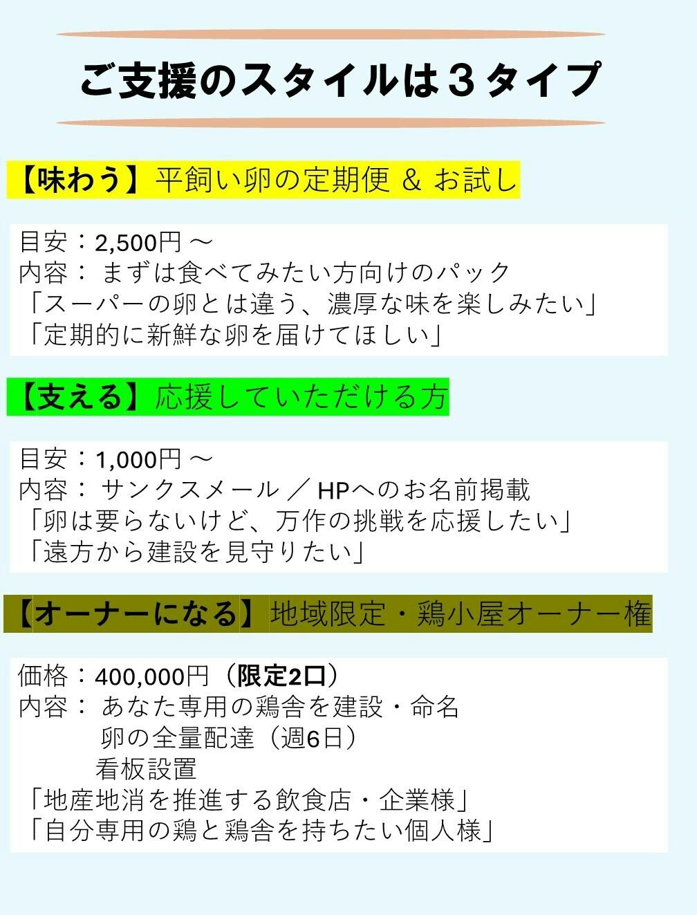 いただいた資金は大切に鶏舎建設に使わせていただきます。