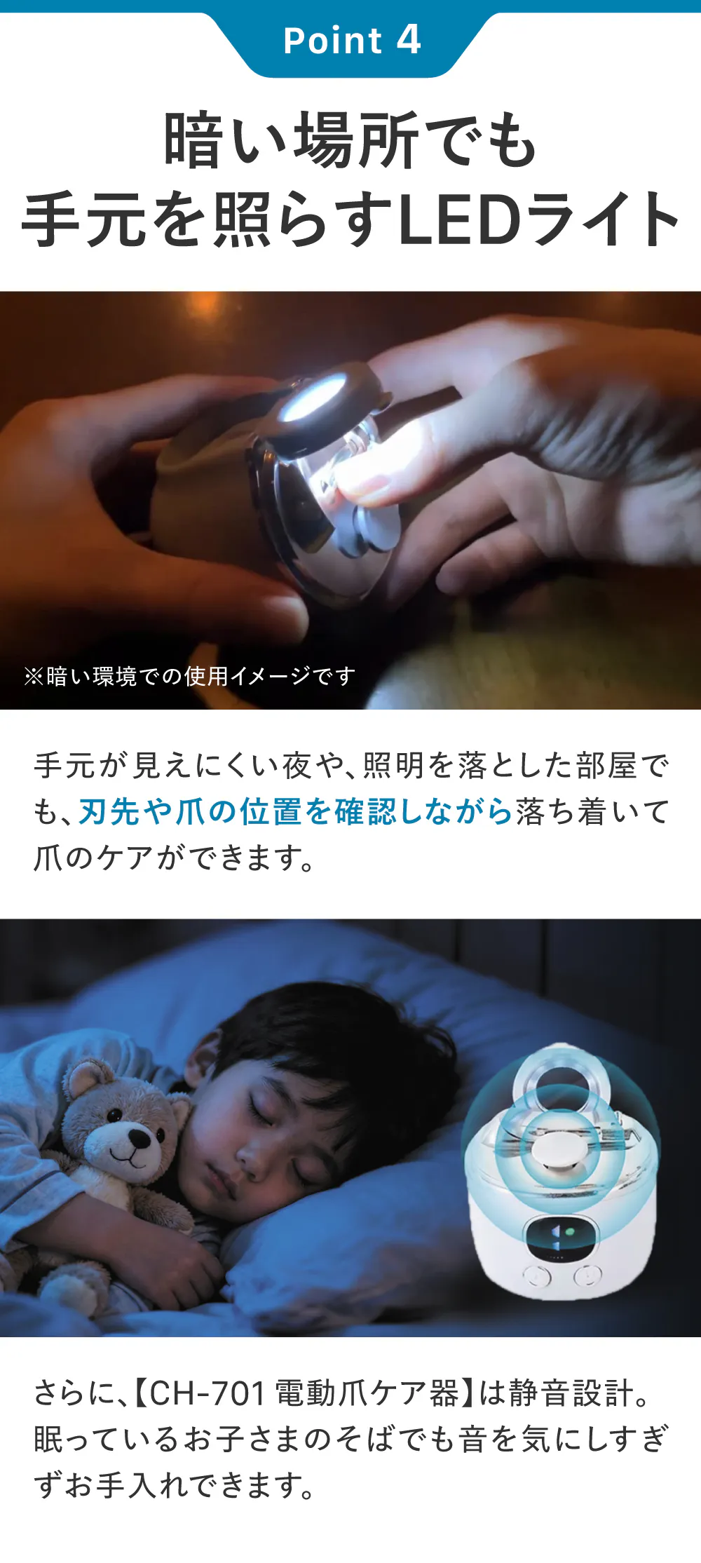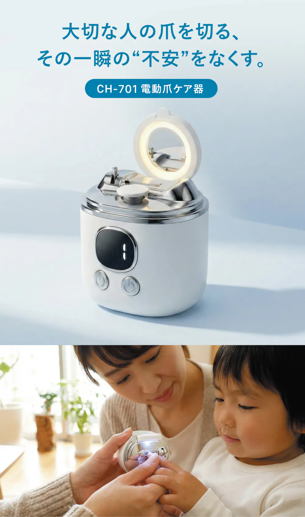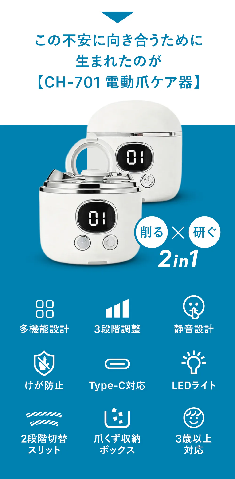その最新モデルが、本プロジェクトでご紹介する電動爪ケア器CH-701です。
