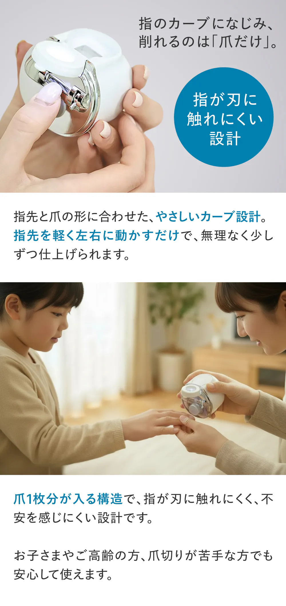 「削る」だけでなく、爪先をなめらかに仕上げることにもこだわり、毎日の爪ケアをより快適に楽しめる一台を目指しています。