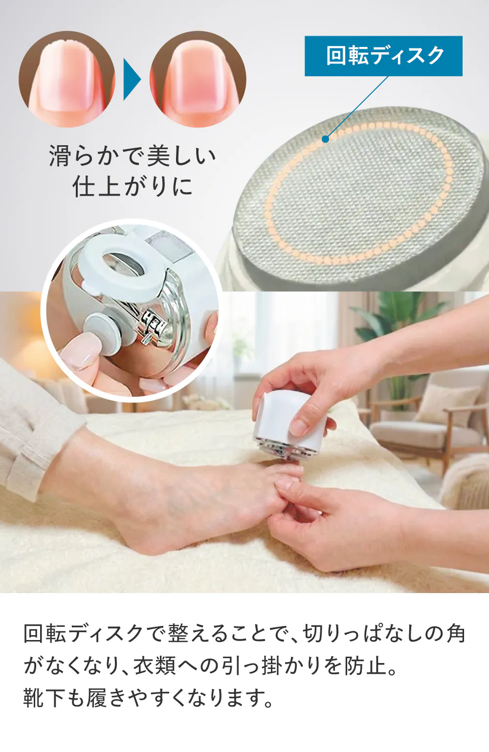 足の爪まわりなど、靴下が引っかかりやすい部分のケアにも役立ちます。