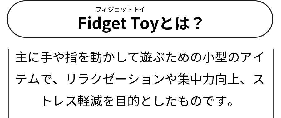 A.フィジェットトイ(Fidget Toy)の機能とは、主に手や指を動かして遊ぶための小型のアイテムで、リラクゼーションや集中力向上、ストレス軽減を目的としたものです。代表的なものにスピナーやスクイーズボールがあり、ストレス解消や集中力向上の効果があるとされています。