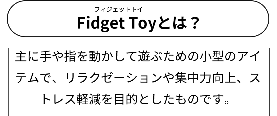 A.フィジェットトイ(Fidget Toy)の機能とは、主に手や指を動かして遊ぶための小型のアイテムで、リラクゼーションや集中力向上、ストレス軽減を目的としたものです。代表的なものにスピナーやスクイーズボールがあり、ストレス解消や集中力向上の効果があるとされています。