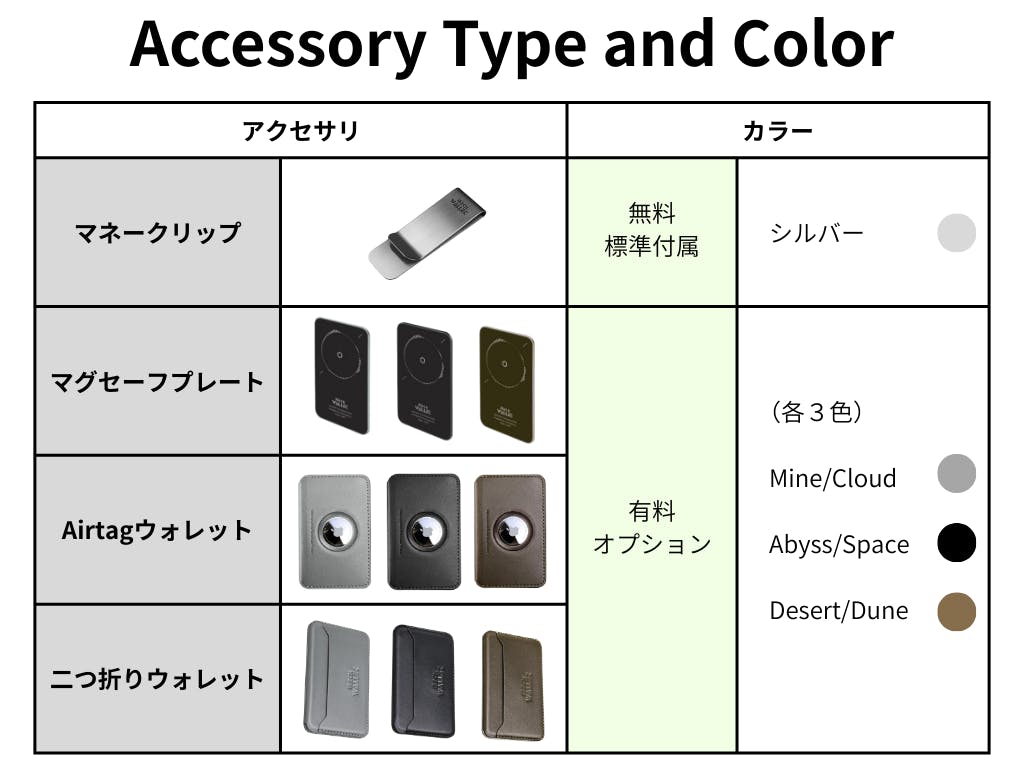 | 材質 | Space-gradeの6063アルミニウム。 アクセサリ(取り外し可能): マグセーフプレート:PC + マグネットアレイ 二つ折りウォレット:アルミニウムフレーム+本革 エアタグウォレット:アルミニウムフレーム+本革 |