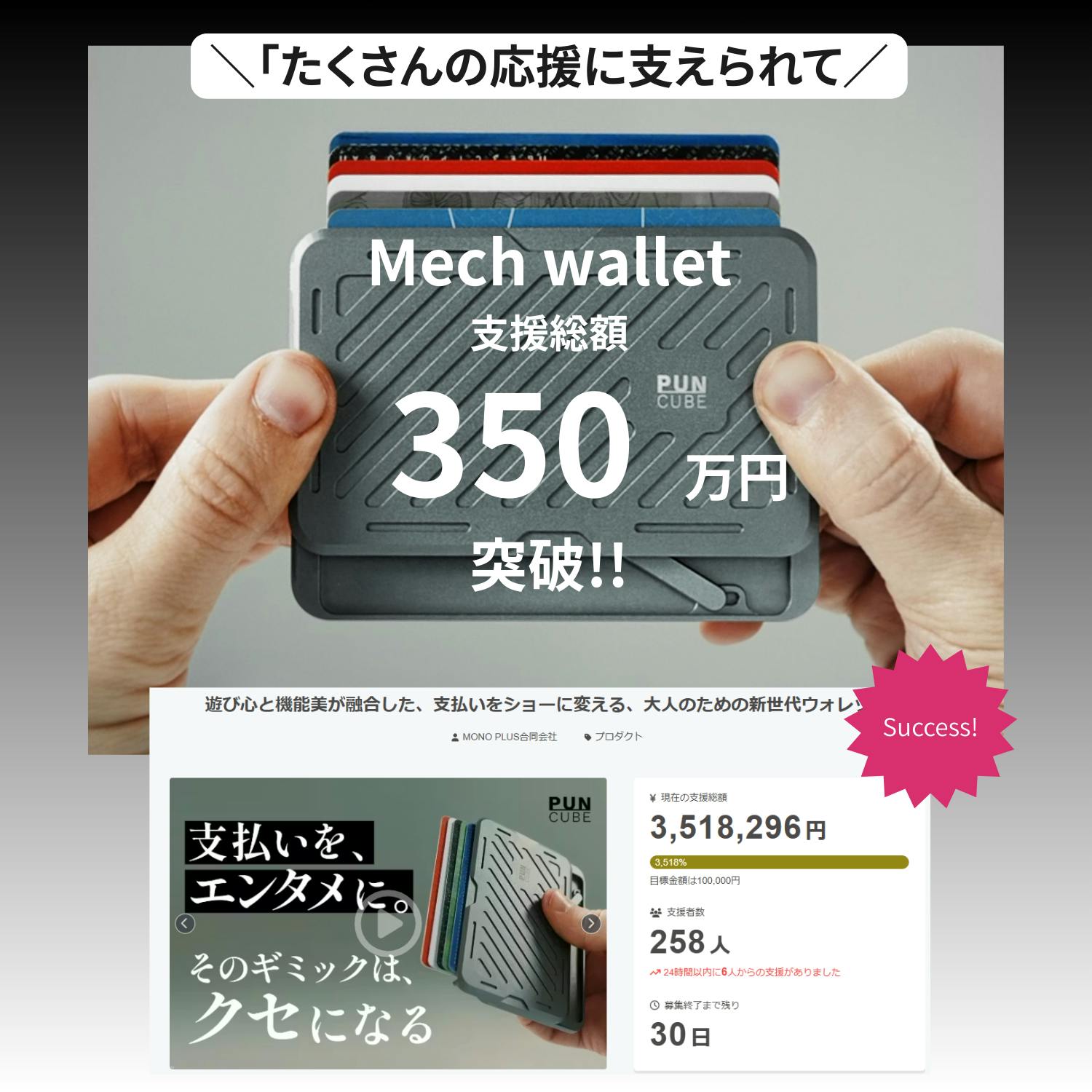 2026/03/02 10:00皆様、いつも温かいご支援を本当にありがとうございます。Mech Walletプロジェクトは、この度支援総額350万円を突破いたしました。多くの皆様にご支持いただいていること、心より感謝申し上げます。ひとつひとつのご支援、応援コメント、お気に入り登録。そのすべてが、私たちの大きな力になっています。改めて、深く御礼申し上げます。◆応援のお願いMech Walletは、「支援購入」という形で、皆様とともに育てていくプロジェクトです。もし可能でしたら、以下の形で応援いただけますと幸いです。・応援コメントの投稿・SNSでのシェア(#mechwallet)皆様の応援が、さらに多くの方へ広がるきっかけとなります。◆ご検討中の皆様へ現在、machi-ya割〈15%OFF〉にてご購入いただけます。さらに、セット割〈23%OFF〉は残りわずかとなっております。一般販売前の特別価格でお求めいただけるのは、本プロジェクト期間中のみです。ぜひこの機会にご検討ください。プロジェクトはまだ続きます。ここからさらに多くの方へ、この楽しさを届けてまいります。引き続き、どうぞよろしくお願いいたします。MONO PLUS合同会社チーム一同 もっと見る