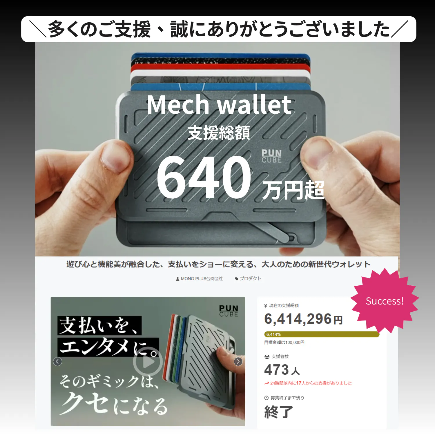 2026/04/01 09:00支援者の皆様へおはようございます。MONO PLUS合同会社です。昨夜、23:59をもって『Mech Wallet』」プロジェクトが、無事に掲載期間を終了いたしました。今回のプロジェクトでは、最終的に640万円を超えるご支援をいただき、私たちの想像を上回る、あたたかい応援を賜りました。多くの皆様にMech Walletの価値に共感いただけたこと、チーム一同、心より感謝申し上げます。本当にありがとうございました。▼ 今後のスケジュール・ご配送について現在、発送に向けた準備を開始しております。メーカーと連携しながら、6月の配送完了に向けて進行してまいります。今後の生産状況や輸送スケジュール、具体的なお届け時期につきましては、本「活動報告」を通じて、随時ご報告させていただきます。Mech Walletが皆様の手元に届き、日々の支払いがよりスムーズで、スマートな体験へと変わることを、私たちも心より楽しみにしております。商品が無事にお手元に届き、ご満足いただくまでが、私たちのプロジェクトです。最後まで責任をもって対応してまいりますので、お届けまで今しばらくお待ちいただけますと幸いです。改めまして、この度は多大なるご支援を賜り、誠にありがとうございました。引き続き、何卒よろしくお願い申し上げます。MONO PLUS合同会社チーム一同 もっと見る