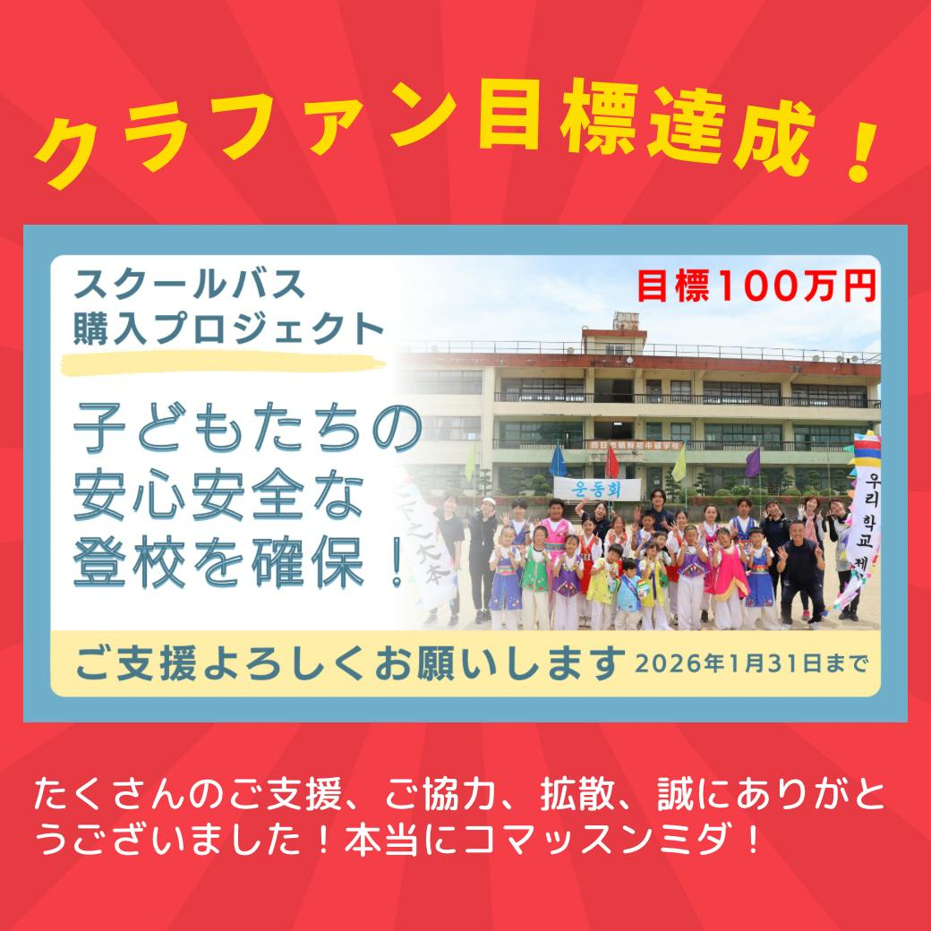 2026/02/01 16:33皆様からの温かいご支援・ご協力のおかげでクラウドファンディング目標金額を達成することができました。スタート当初は不安や焦りもありましたが、「子どもたちの未来のために」という想いを胸に、約1か月半、走り切ることができました。ご支援くださった皆様拡散にご協力いただいた皆様温かいコメントを寄せてくださった皆様本当にありがとうございました!コマッスンミダ!皆様からお預かりした支援金は、三重県青商会が責任をもってハッキョ教育会へお渡しいたします。スクールバス購入が完了次第、改めてご報告します。이어가자‼미에‼청상회‼갱신‼#クラウドファンディング#目標達成#感謝#子どもたちの未来のために#三重県青商会#ハッキョ#이어가자미에#청상회갱신 もっと見る