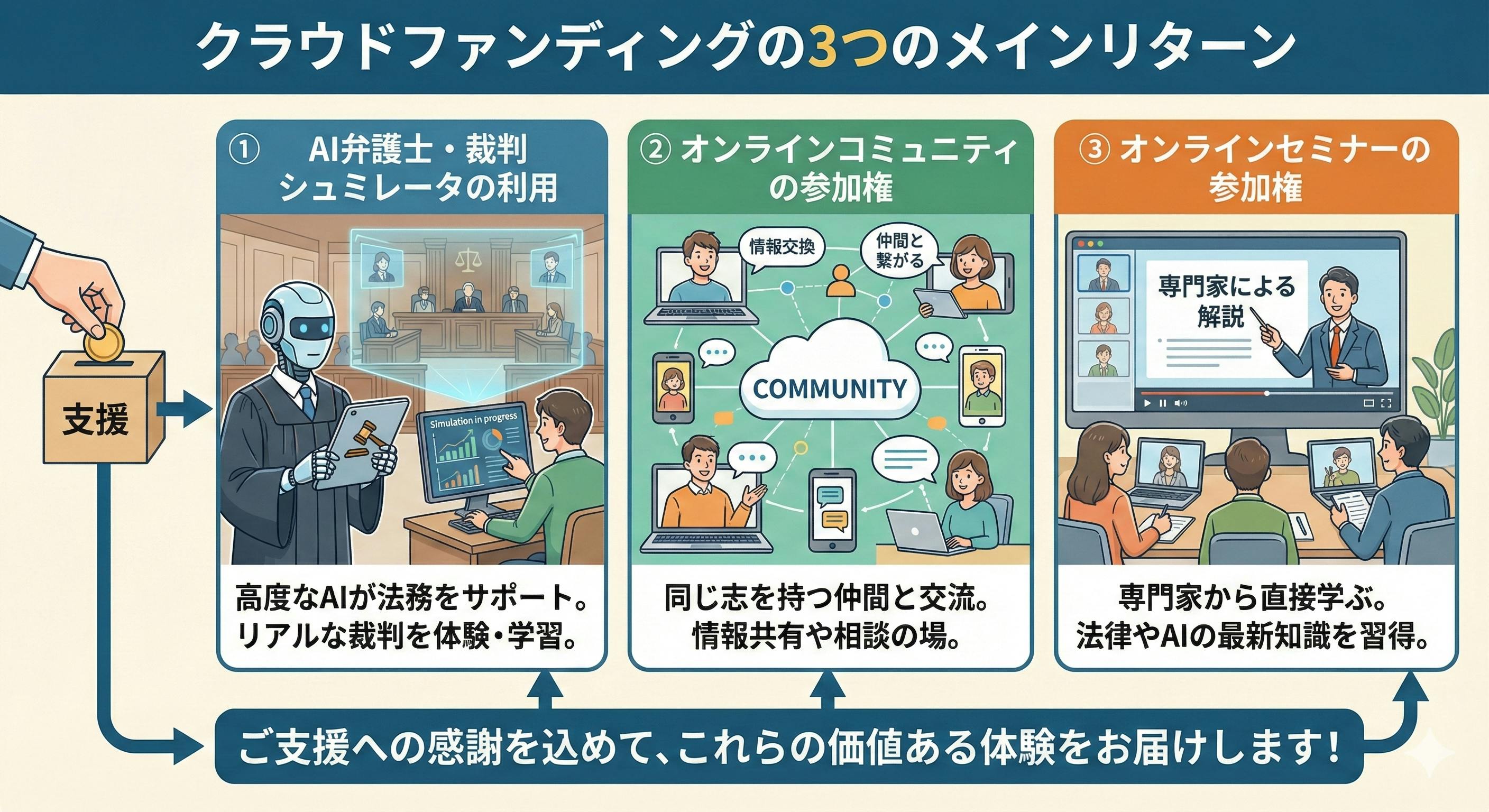 あなたの今日の支援が、明日、あなた自身やあなたの大切な家族が不当なトラブルに巻き込まれた時、何十万円もの弁護士費用を払うことなく、何度でも無料でAI弁護士に相談できる「権利」となって、直接あなたに返ってくるのです。