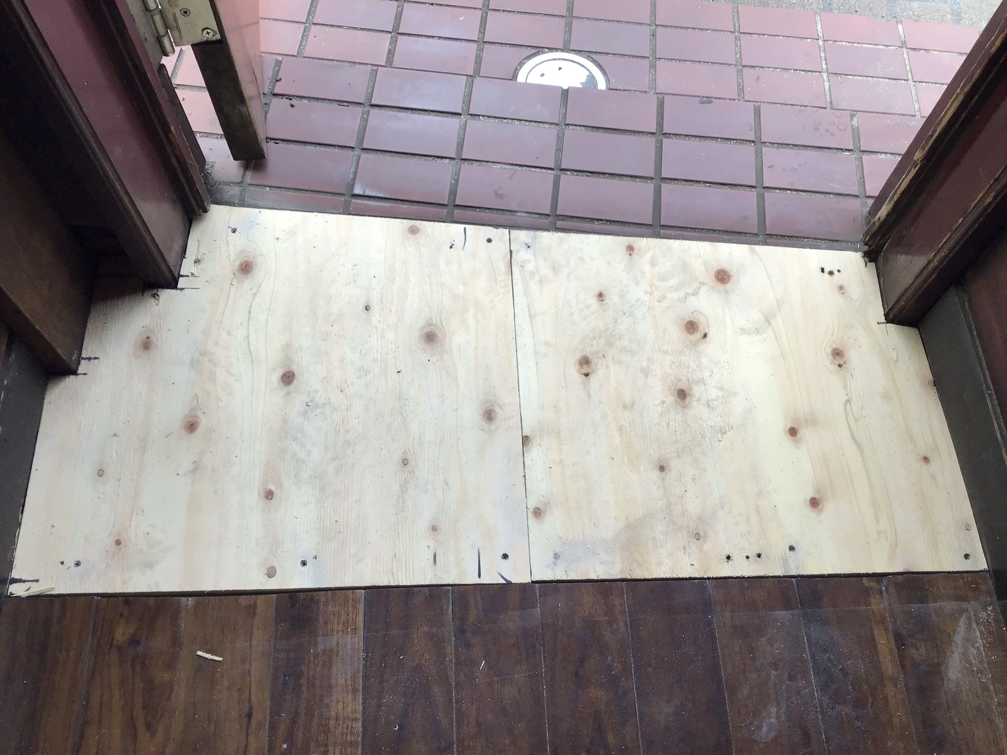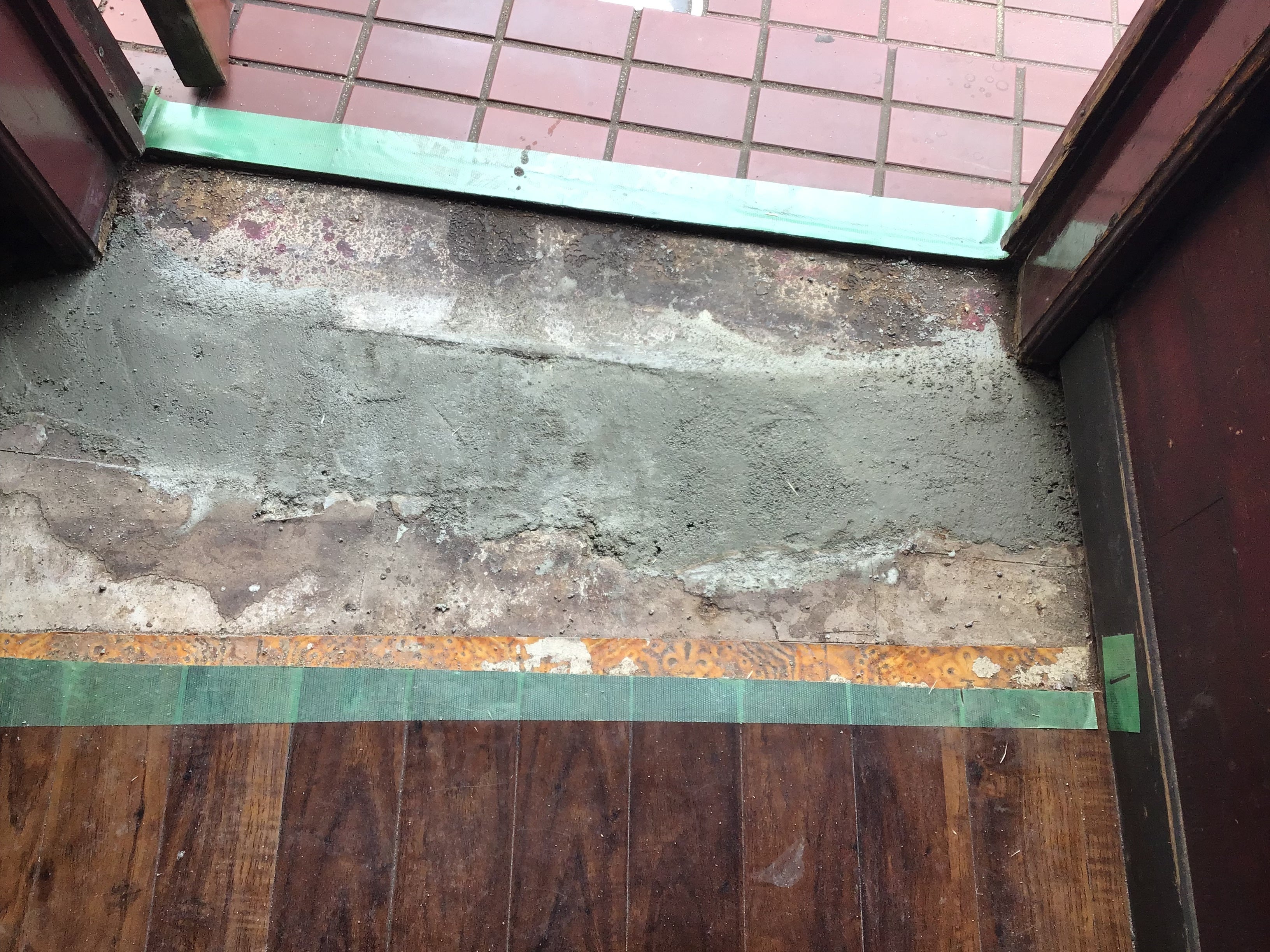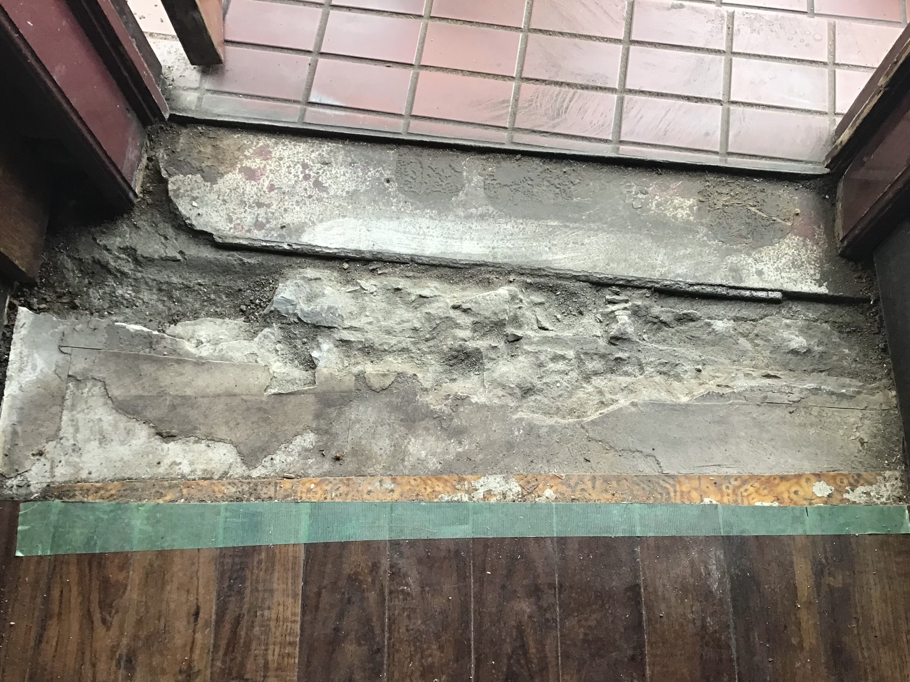 そして本日、入り口のベコッと踏み抜きそうになっていた床を、ジャムで知る人は知る大工さんがなおしてくれました。床を剥がすと、踏み抜きはしないけどここだけコンクリートがでこぼこ。