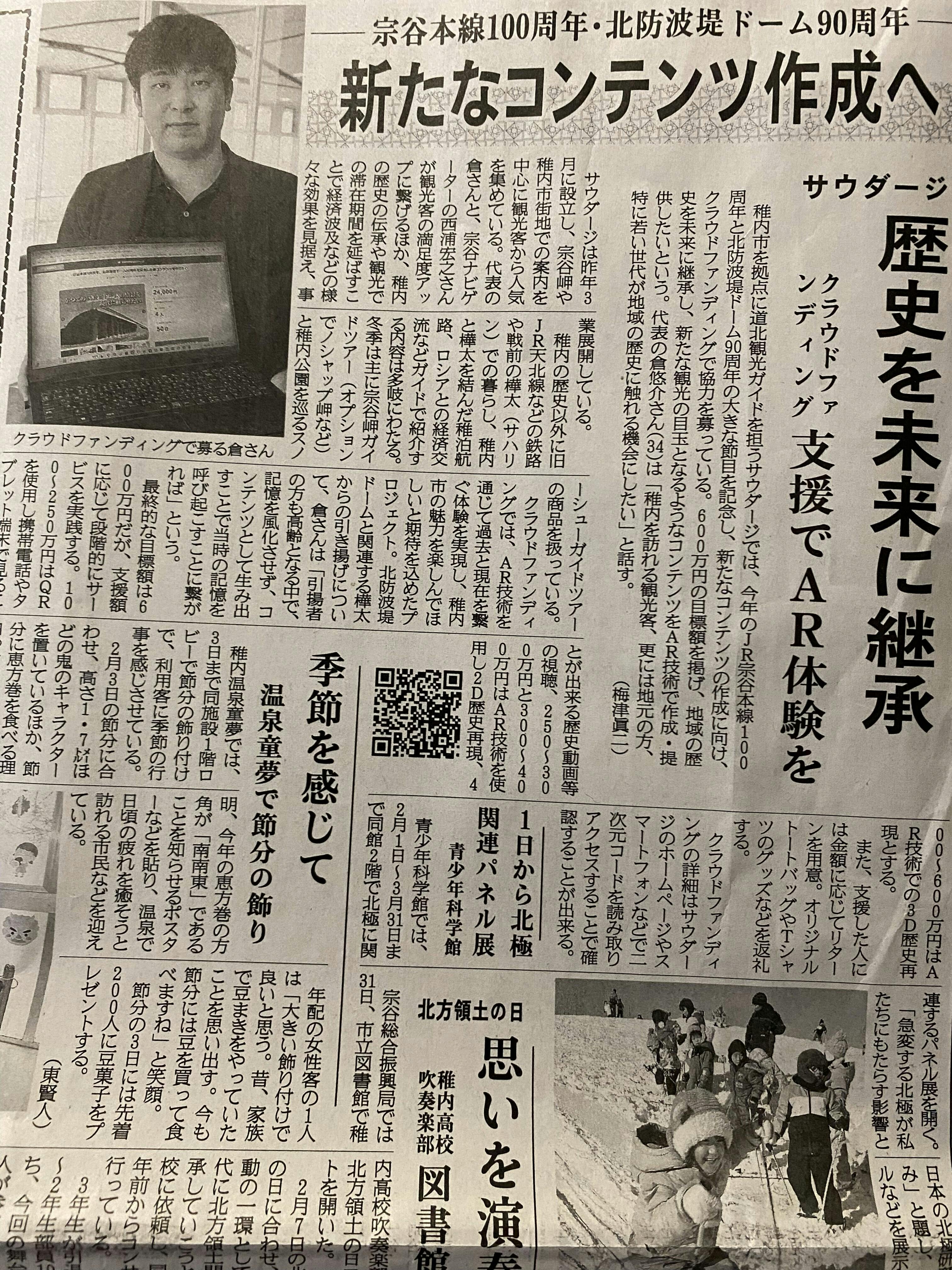 2026/02/05 17:09【北海道新聞(留萌宗谷版)に掲載いただきました。】2月4日発売の北海道新聞(留萌宗谷版)に当クラウドファンディングの記事が掲載されました。ありがたいことに結構大きく掲載いただきました。現在まだ6%ほどの達成率となっており、中々厳しい状況となっておりますが最後まで継続して頑張っていきたいと思います。ご支援いただいた皆様、引き続き応援の程よろしくお願いいたします。もし、当ガイドサービスの活動に興味をお持ちいただけましたらInstagramやFacebookなどでガイドの様子などを載せておりますので、よければフォローの上ご覧いただけると嬉しいです。検索方法:サウダージ稚内で検索 もっと見る