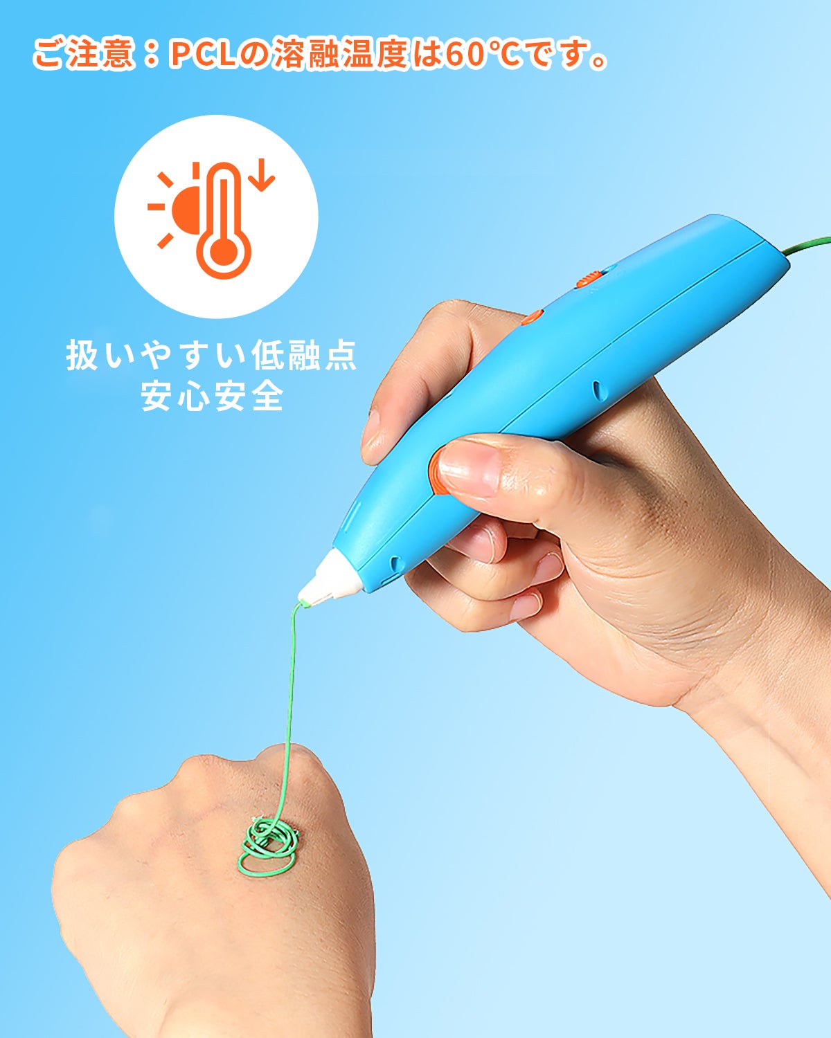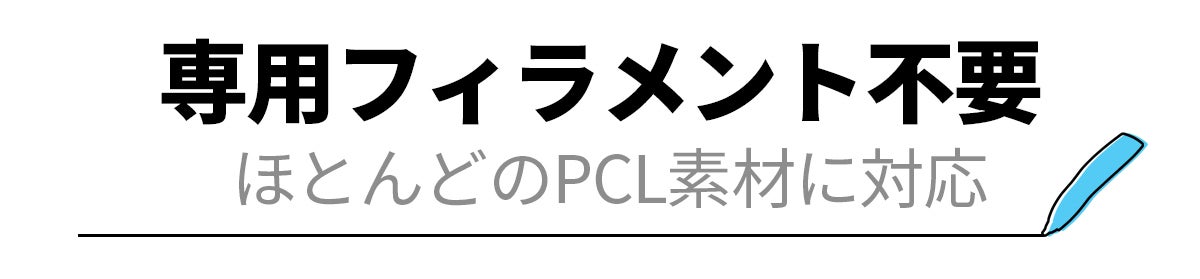 💸高価な専用フィラメントは必要ありません。一般的な低融点のPCLフィラメントに対応しているため、ランニングコストを抑えてたっぷり創作を楽しめます。さらに、PCL素材は無毒で子供でも安全にご利用いただけるのも特徴です。