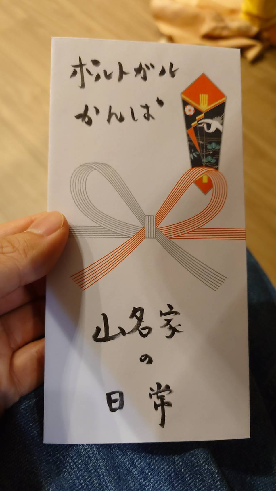 手書きののし袋をいただき、ご夫婦連名での温かいご支援にメンバー一同感激しています。本当にありがとうございます…!