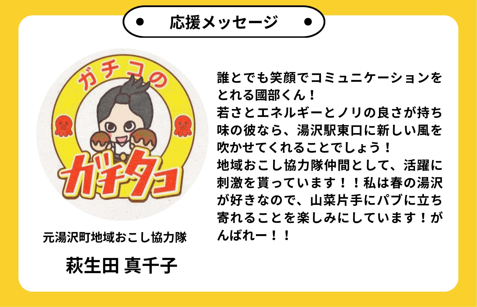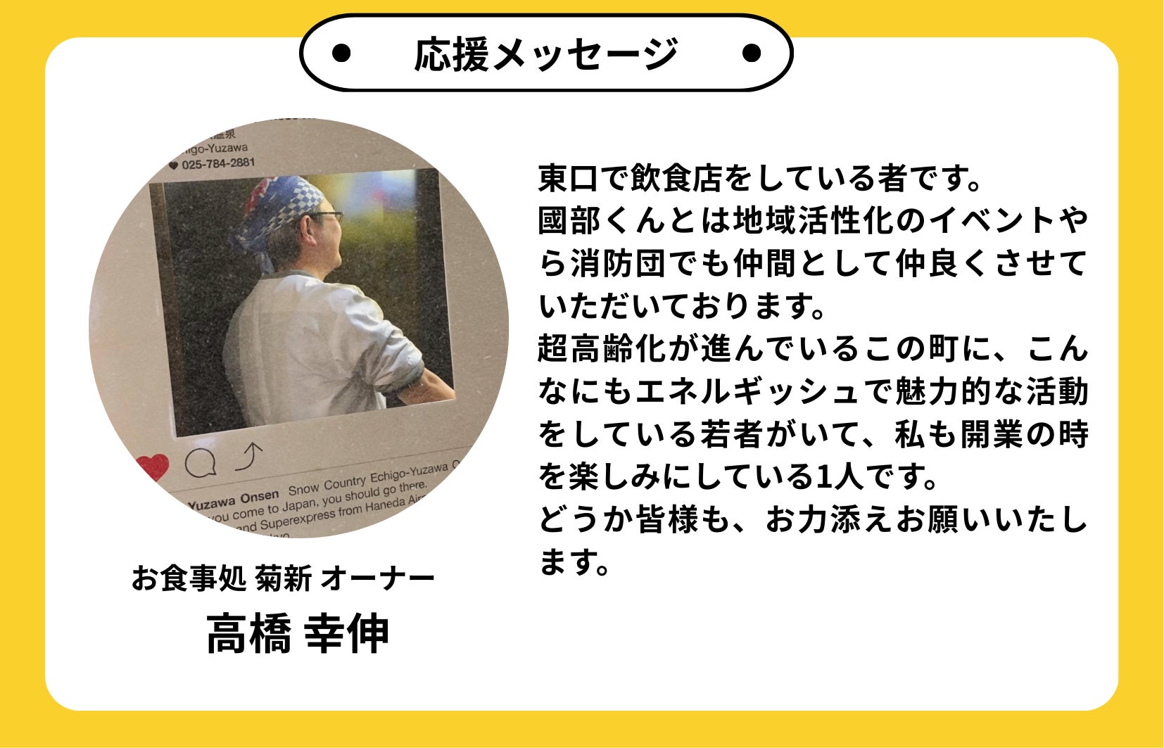 そして、「冬以外は誰も来ない」と言われる湯沢町に、通年で人を呼び込み、湯沢を年中楽しめる観光地に変えていきたいです!!