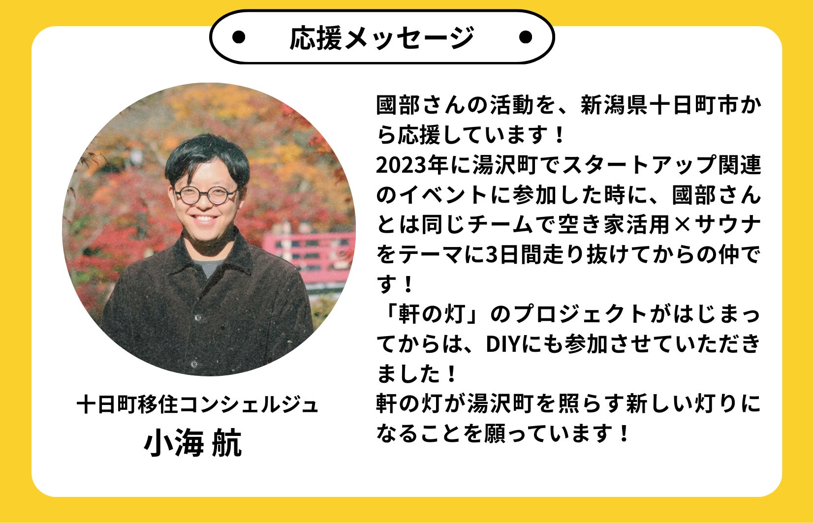 改めまして、発起人の國部(こくぶん)です。現在、湯沢町で築70年の空き家を取得し、ゲストハウス&バー開業に向けリノベーションを進めている27歳です。