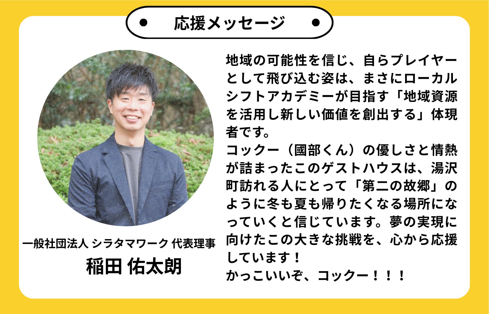 この場を通じて、湯沢の日常に冬以外の賑わいという新しい風景をつくること。それが、移住者である私の使命だと思います。