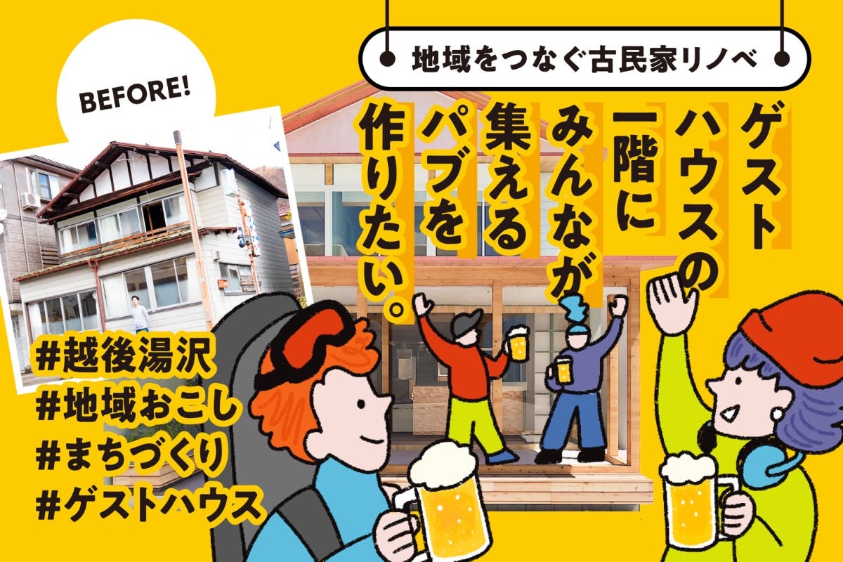 リノベ中のゲストハウスの1階に、誰でも気軽に立ち寄れるスタンドパブを作ることで、宿泊者だけでなく、地元の方や移住者の方、ローカルに興味のある社会人、大学生など、さまざまなヒトとヒトをつなぎ、心動く瞬間をつくりたい。