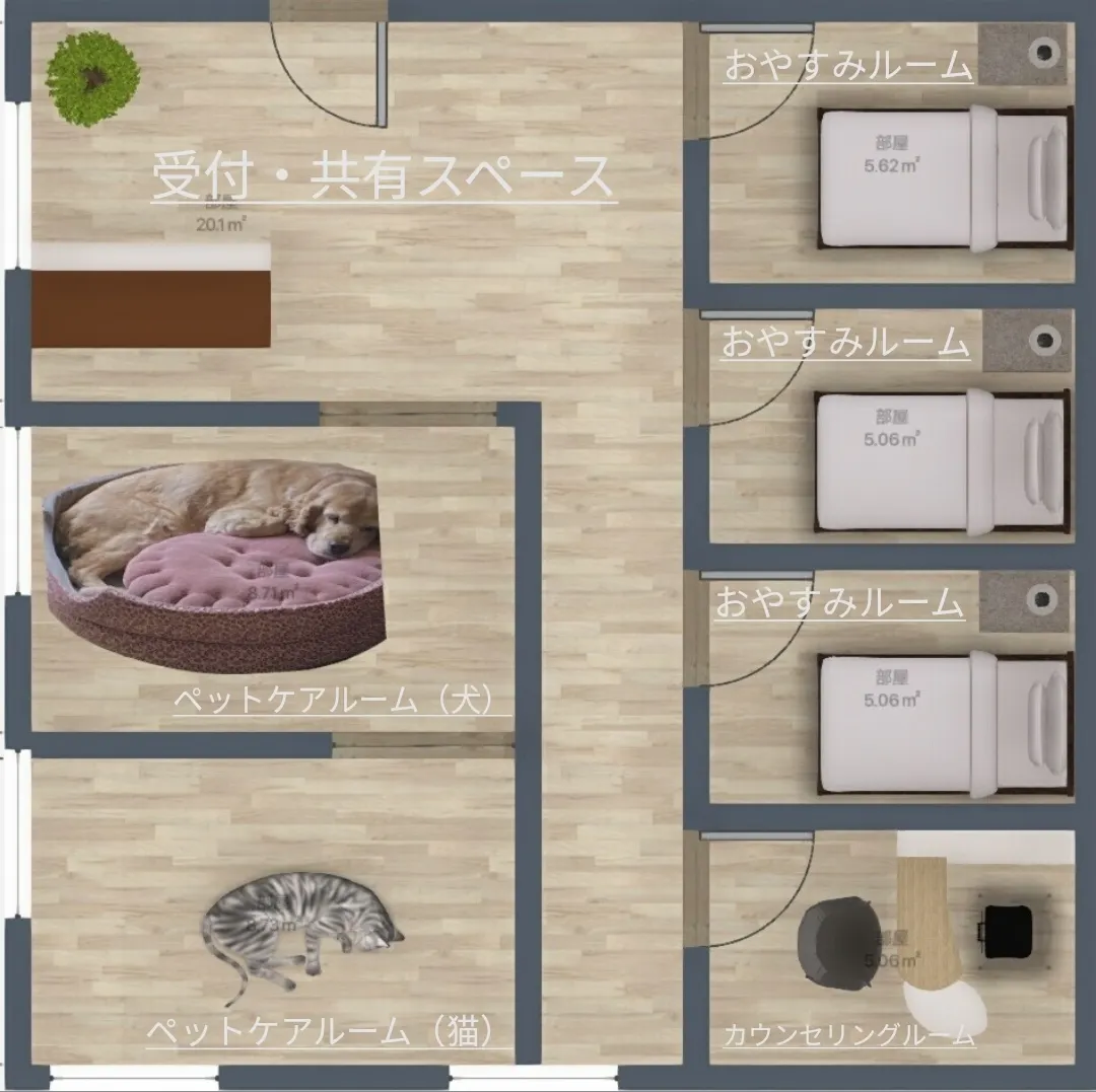 全国的に見ても、老犬・老猫ホーム、ペット共生型介護施設、ペット共生型グループホームはありますが、「ペット介護(短時間)+飼い主様が共に施設で休める(鍵付き個室で仮眠ができる)+カウンセリング」の三機能を備えた施設は非常に珍しく、私の描く「一時利用(預け+休息)+心理ケア支援+高度ケア」は他の施設とは明確に差別化でき、強みになると思います。