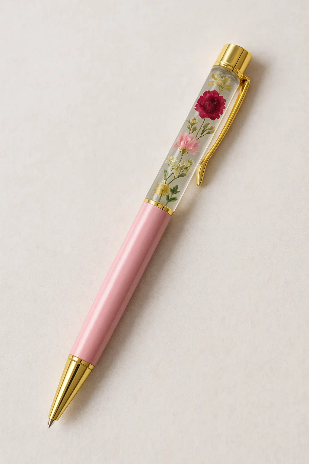 お礼の手紙と、私の趣味で作っている ハーバリウムボールペンをお届けいたします。