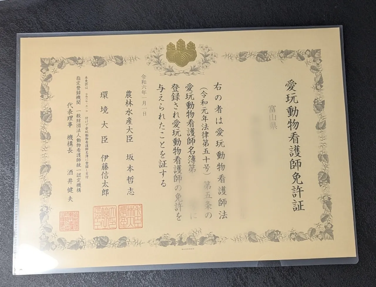 (国家資格である愛玩動物看護師免許取得。愛玩動物飼養管理士も取得しています。また、ペットフードメーカーのロイヤルカナン、ヒルズのペットフードアドバイザーのプログラムも修了しています。今はペットケアカウンセラーの勉強中で、来年8月には資格取得予定です)