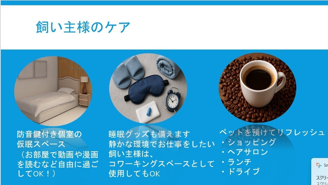 そして、疲れ切った飼い主様ご自身が「少しだけ休みたい」「数時間だけ眠りたい」そう願ったときに、ペットと共に利用できる場所。