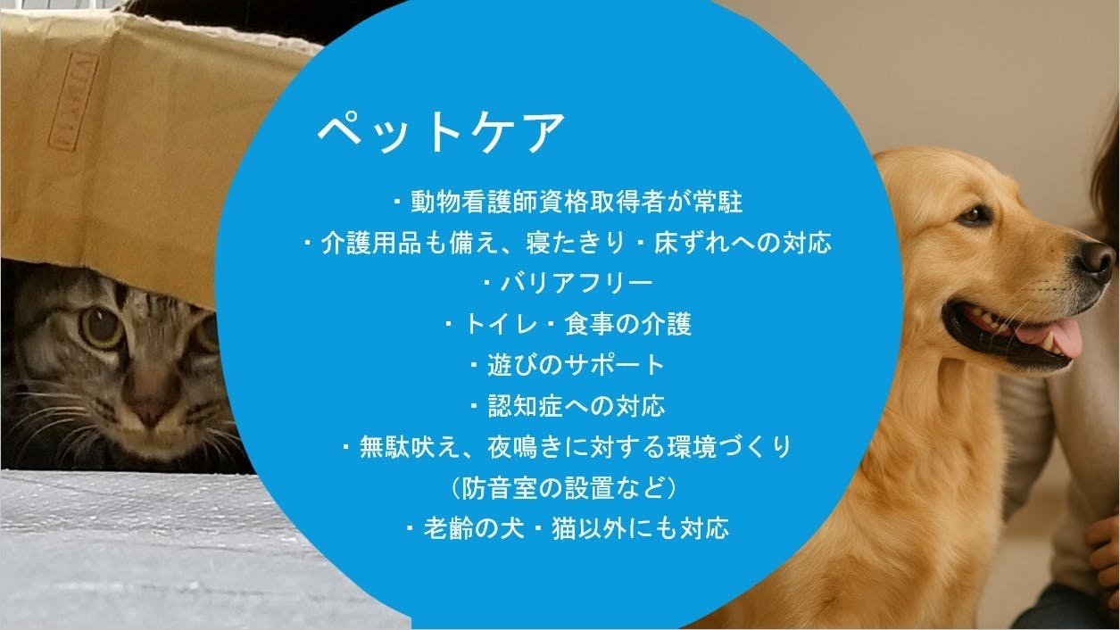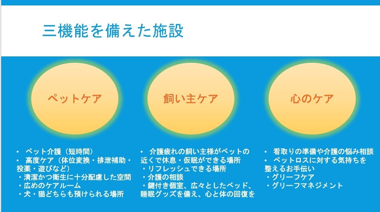 全国的に見ても、老犬・老猫ホーム、ペット共生型介護施設、ペット共生型グループホームはありますが、「ペット介護(短時間)+飼い主様が共に施設で休める(鍵付き個室で仮眠ができる)+カウンセリング」の三機能を備えた施設は非常に珍しく、私の描く「一時利用(預け+休息)+心理ケア支援+高度ケア」は他の施設とは明確に差別化でき、強みになると思います。
