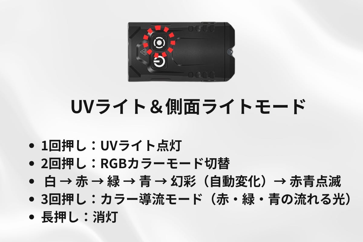 側面モード 単押し:UVライト点灯/再押しで消灯