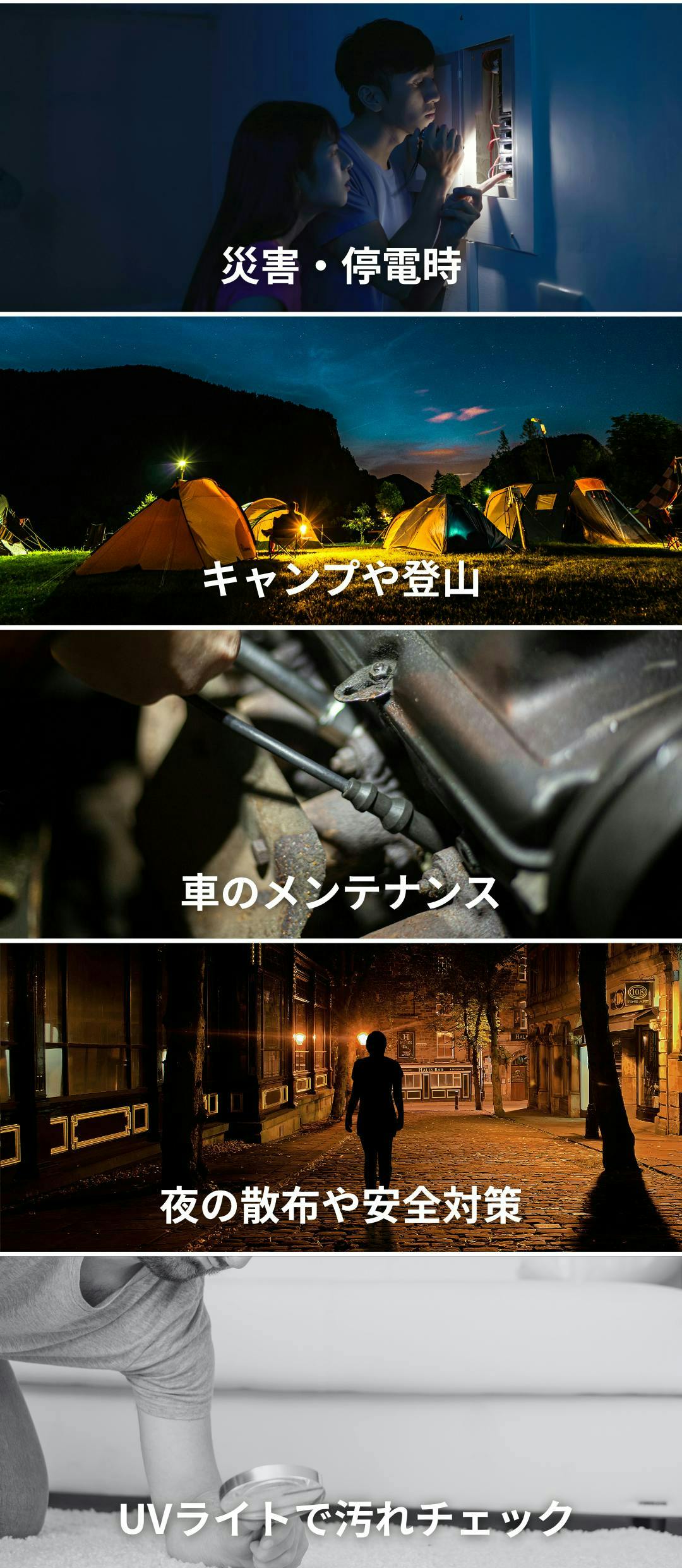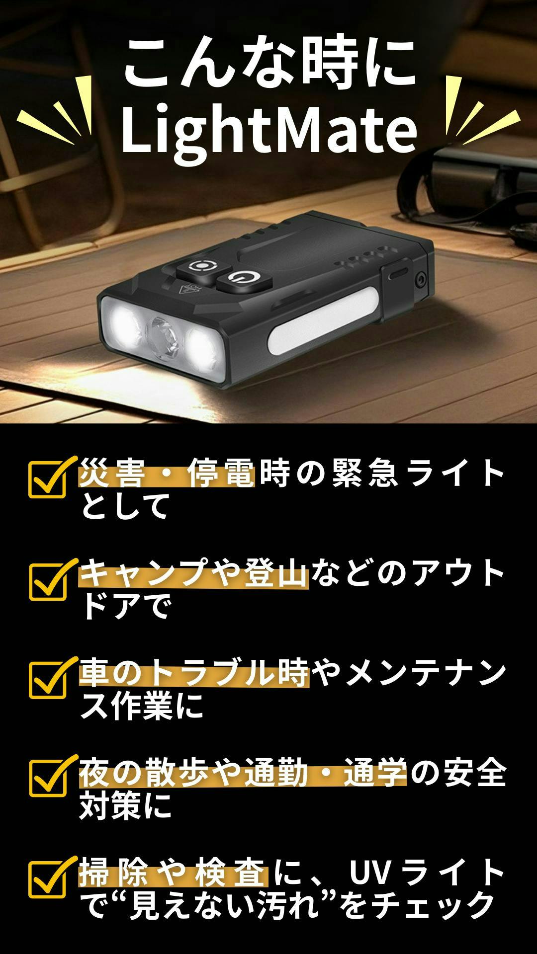 災害時の停電、アウトドア、車の修理、夜の散歩、UVによる汚れチェックまで。LightMateは、1台で日常から非常時までしっかり対応。