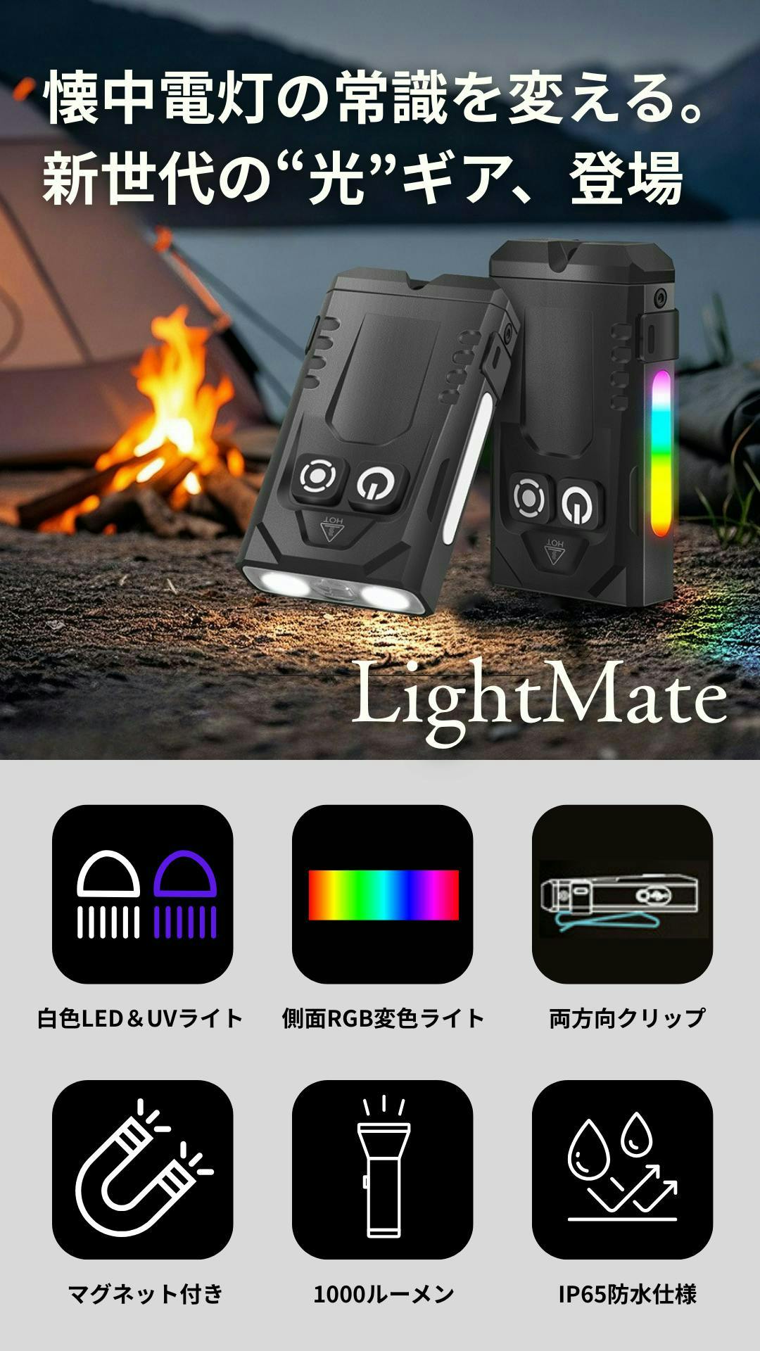LightMateは、白色LED・UVライト・RGBカラーモードの3つの光源を搭載。照明、検査、演出など用途に応じて使い分けができ、暗所作業からレジャーまで幅広く対応します。シーンに合わせて、最適な光をいつでも手軽に選べます。