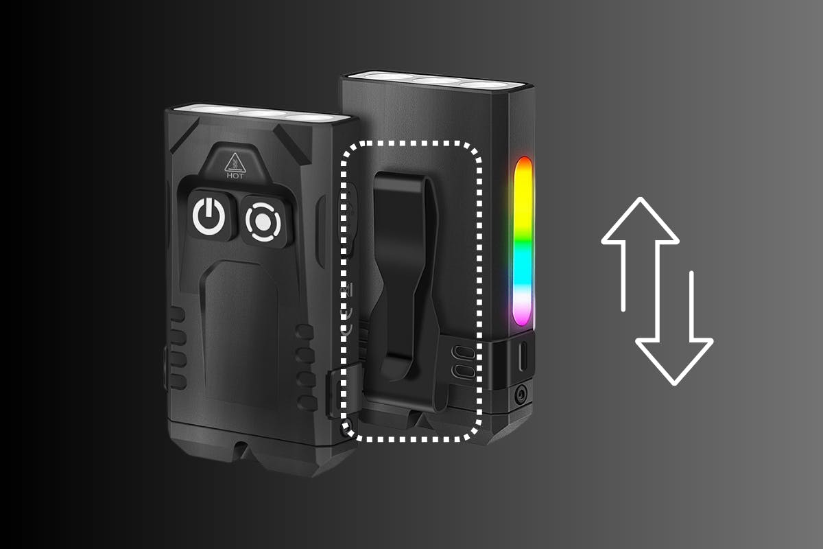 本体には両方向対応のクリップを搭載しており、上下どちらの向きでもしっかり固定できます。帽子のつばやバックパックのベルト、ポケットなどに取り付けてハンズフリーで照らせるため、夜間の作業や移動時にも便利。使う場所を選ばず、柔軟に対応できます。