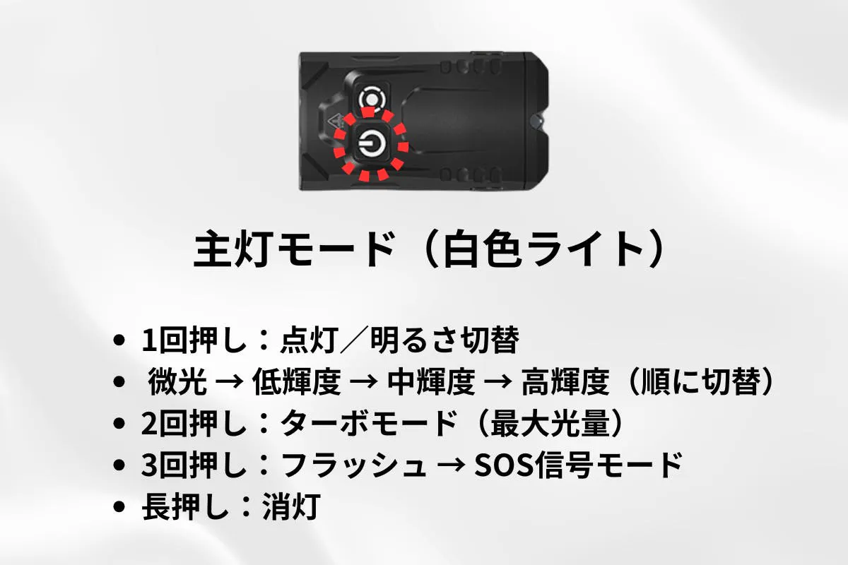 主灯モード 単押し:微光 → 低輝度 → 中輝度 → 高輝度(ループ)