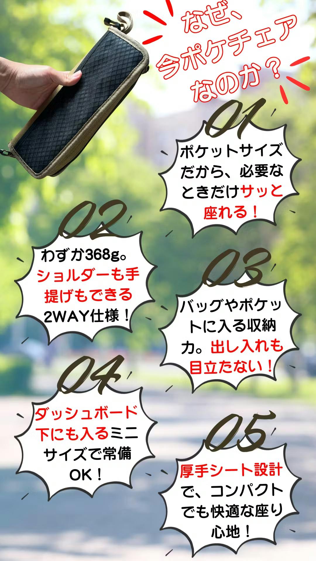 日常の中で「ちょっと座りたい」「でも荷物は増やしたくない」と感じることが多く、そんな思いからこのチェアを形にしました。持ち運びが楽で、使わない時はどこにでもしまえる。シンプルだけど、使ってみると手放せなくなる。そんな“ちょうどいい存在”を目指しています。アウトドアが好きな方も、日常で便利に使いたい方も、ぜひ一度ポケチェアのある暮らしを体験してみてください。応援よろしくお願いします!