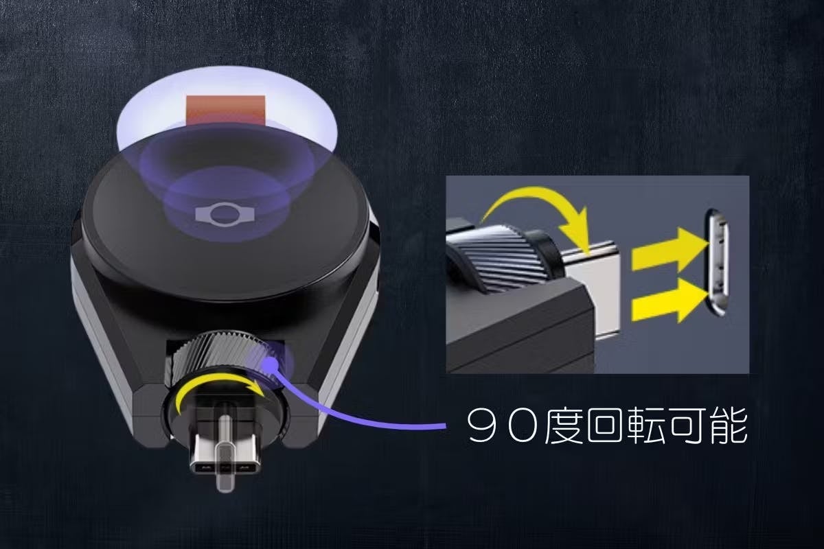 A. アダプターが90度回転することで、狭い場所やデバイスのポートが使いにくい角度にある場合でも、自由に調整して充電が可能です。
