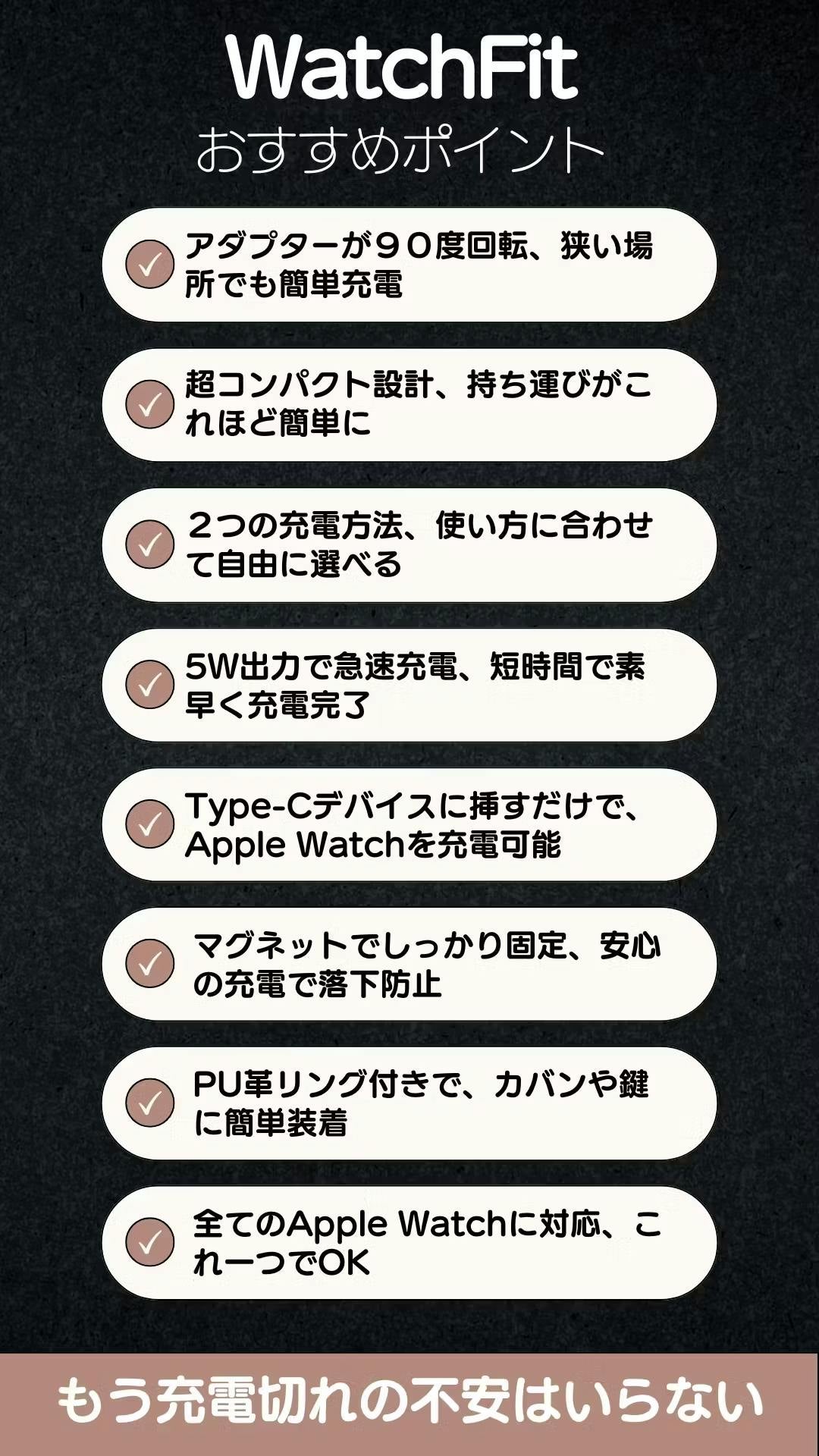 Apple Watchをお使いの方々が、どこにいても充電の心配をせずに安心して過ごせるよう、私たちは「WatchFit」にこだわりを詰め込みました。外出先や旅行中、さらにはオフィスや自宅でも、手軽にApple Watchを充電できるよう設計されています。