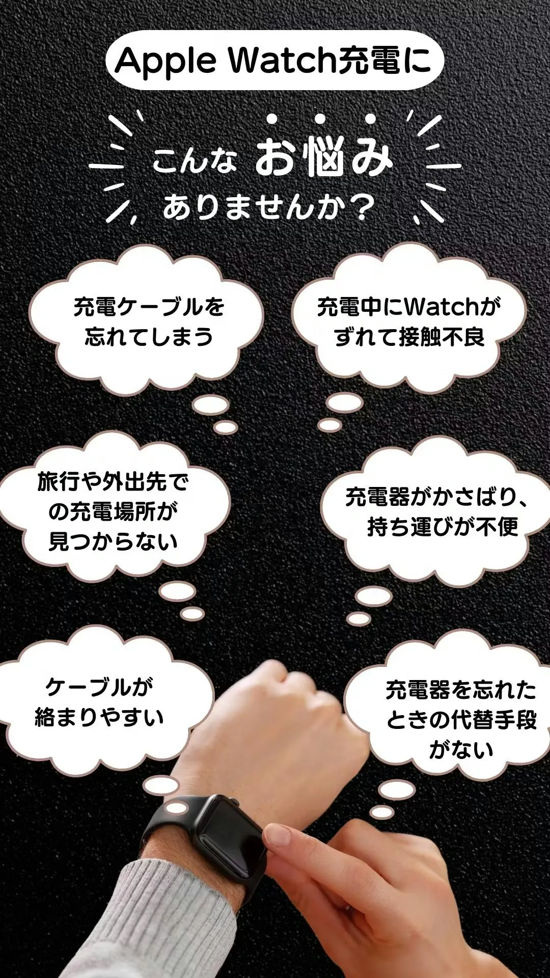 Apple Watchを日常的に使う上で、充電にまつわる悩みはつきものです。「充電ケーブルを忘れた」「外出先で充電できない」「持ち運びが面倒」など、毎日のように発生するこれらの悩みを、「WatchFit」が一挙に解消します。