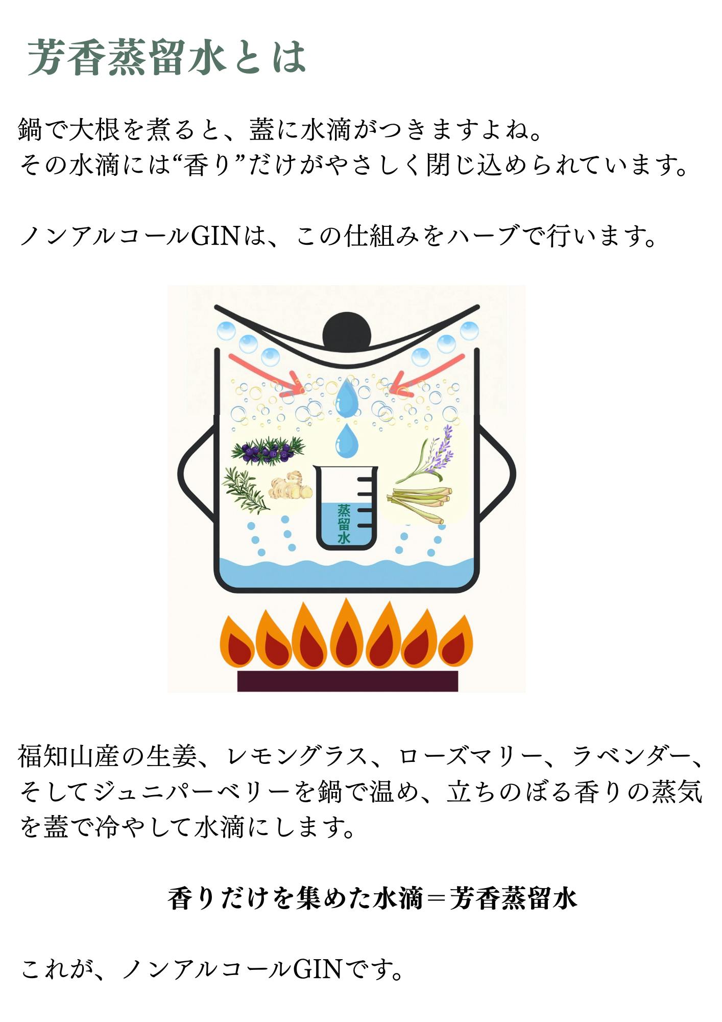 今回お届けする「ノンアルコールGIN」は、福知山産の生姜・レモングラス・ラベンダー・ローズマリーなどを丁寧に蒸留してつくる、透明でノンアルコールの芳香蒸留水です。