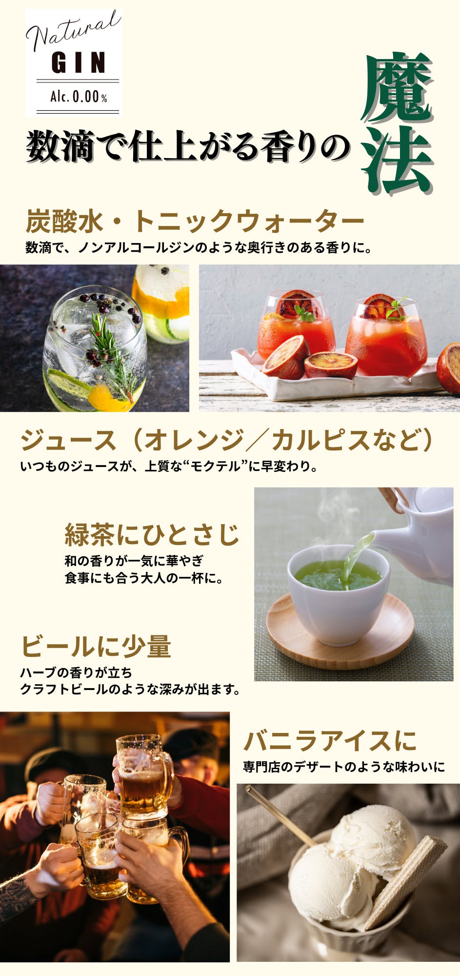 お酒ではありませんが、ジンの象徴でもあるジュニパーベリーを使用することで、やさしいジンらしさが香りとして残ります。