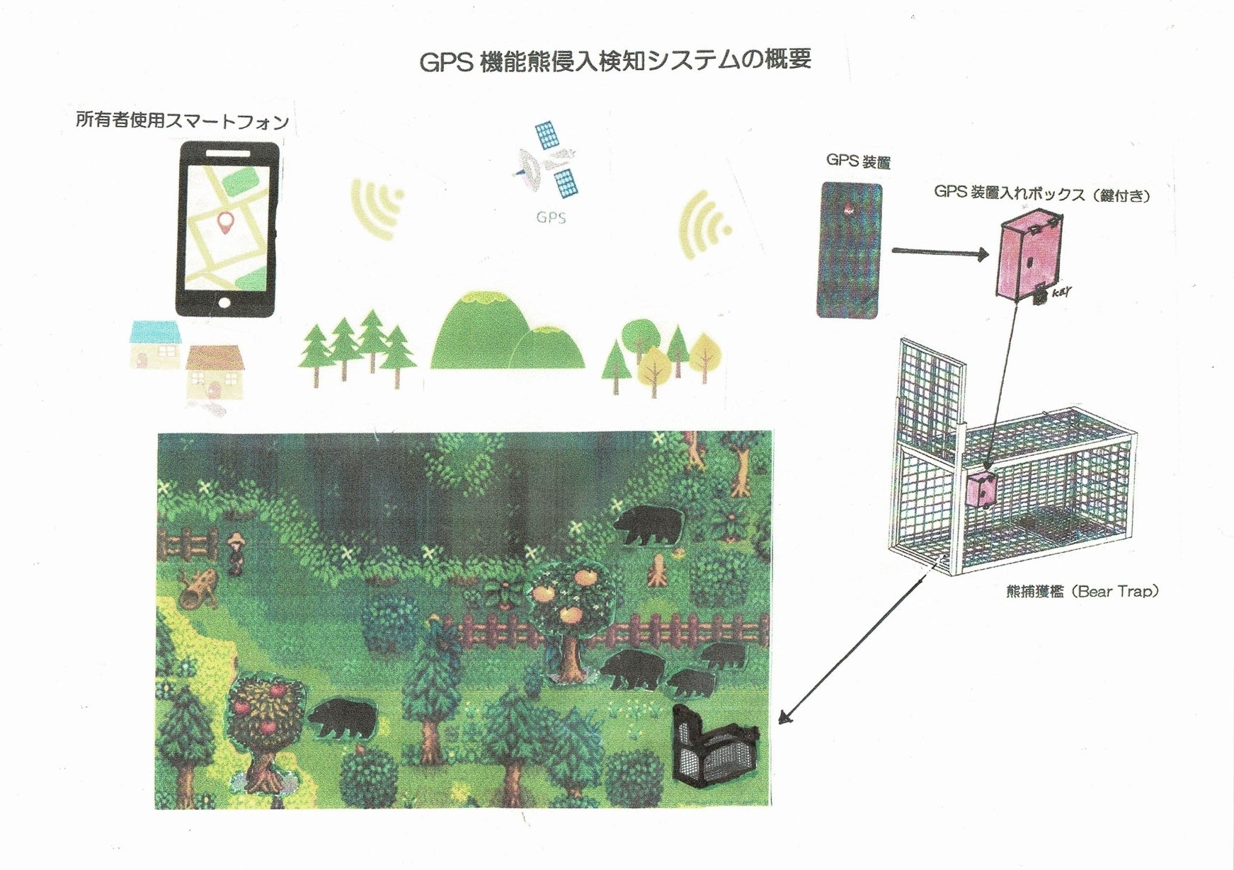 この檻のシャッター付近に「GPS機能熊侵入検知装置」ボックスを設置します。熊が檻の中に入ればGPSにより檻所有者のスマホに位置情報が送られます。毎日、檻の見回りをすることなく捕獲状況を安全に確認出来ます。この検知装置は購入者様のオプションとします。