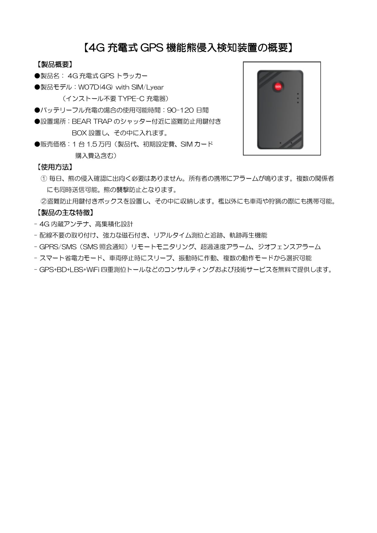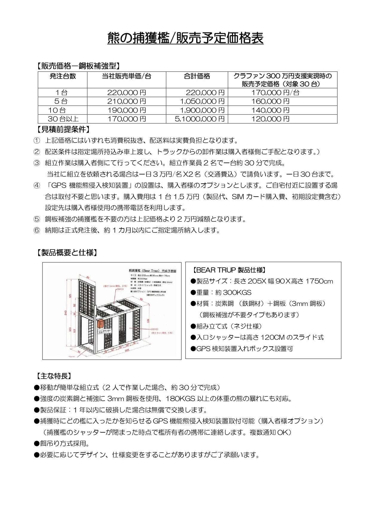 例えば、30台一括発注の場合、日本到着渡し価格一台20万円(消費税込)の当社販売価格を、300万円の支援が集まれば1台10万円で提供することが可能になります。また、GPS機能付き熊侵入検知装置をオプションで装備し、遠隔地に設置した捕獲檻への侵入を自動で携帯電話に通知する遠隔監視安全システムも導入いたします。