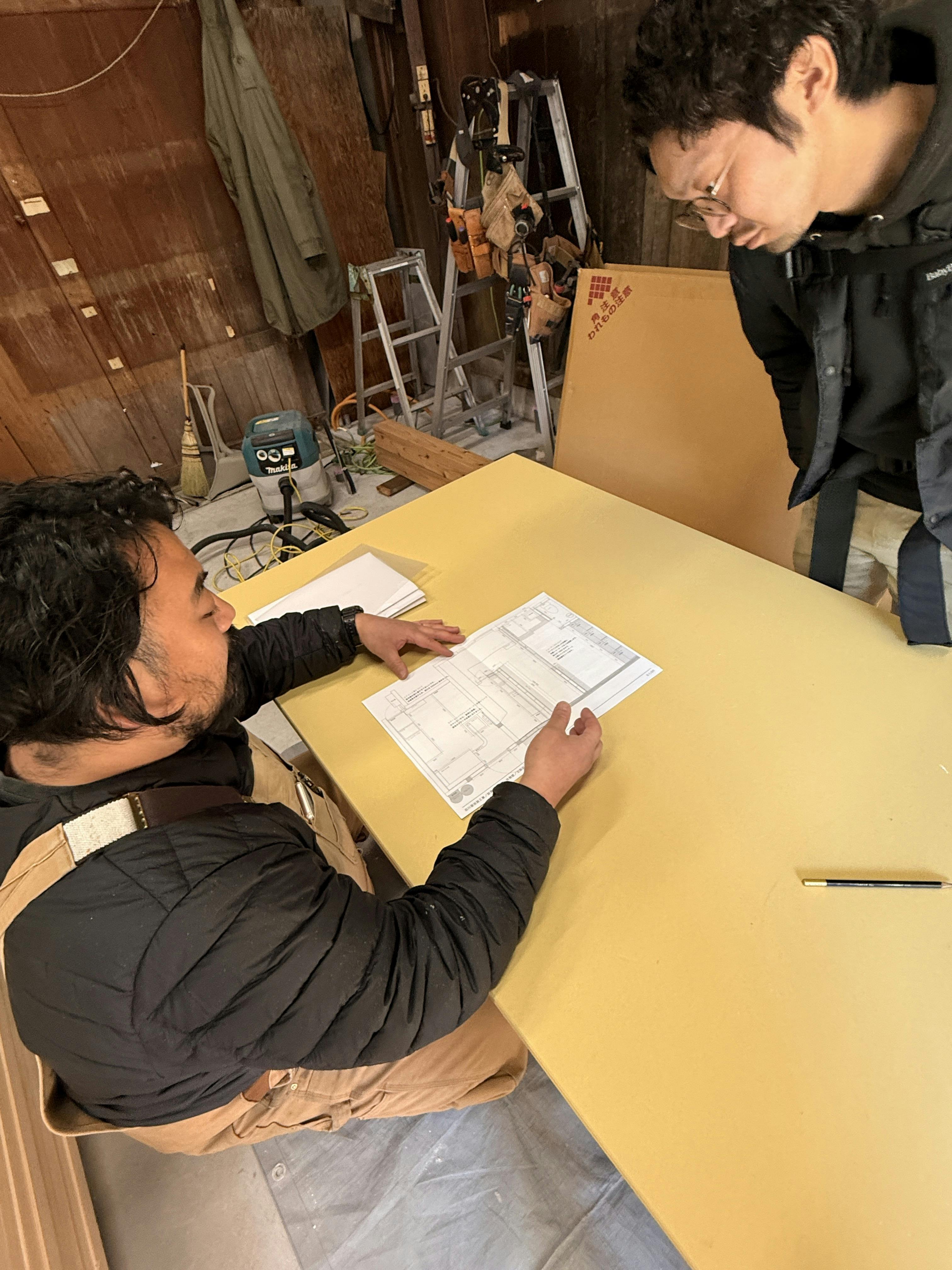 先日は、内装を手掛けてくださるヤマカワさんに作成いただいた詳細な図面を元に、現場で打ち合わせを行いました。