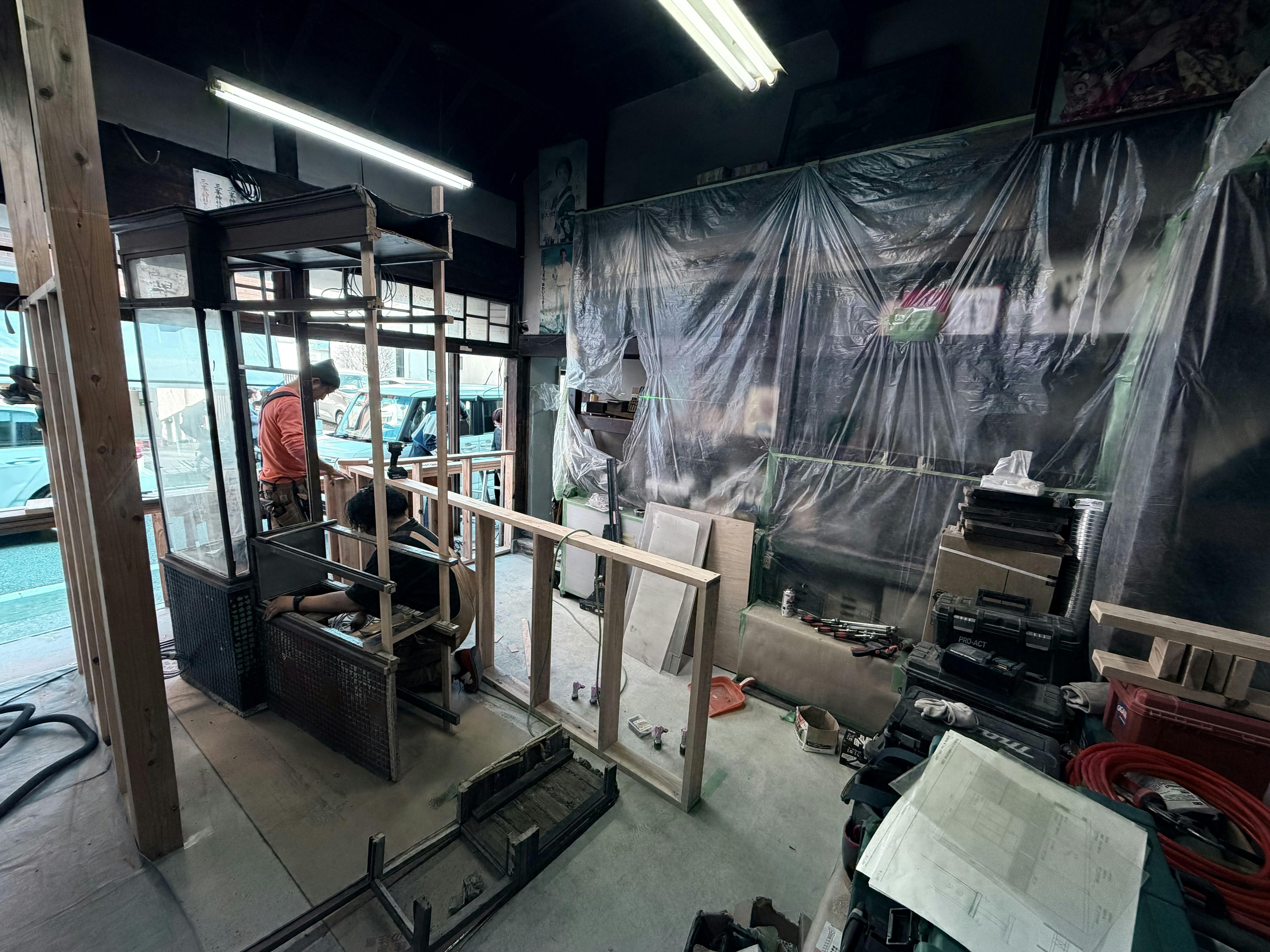 角打ちなおらいのスペースや厨房の壁も立ち上がり