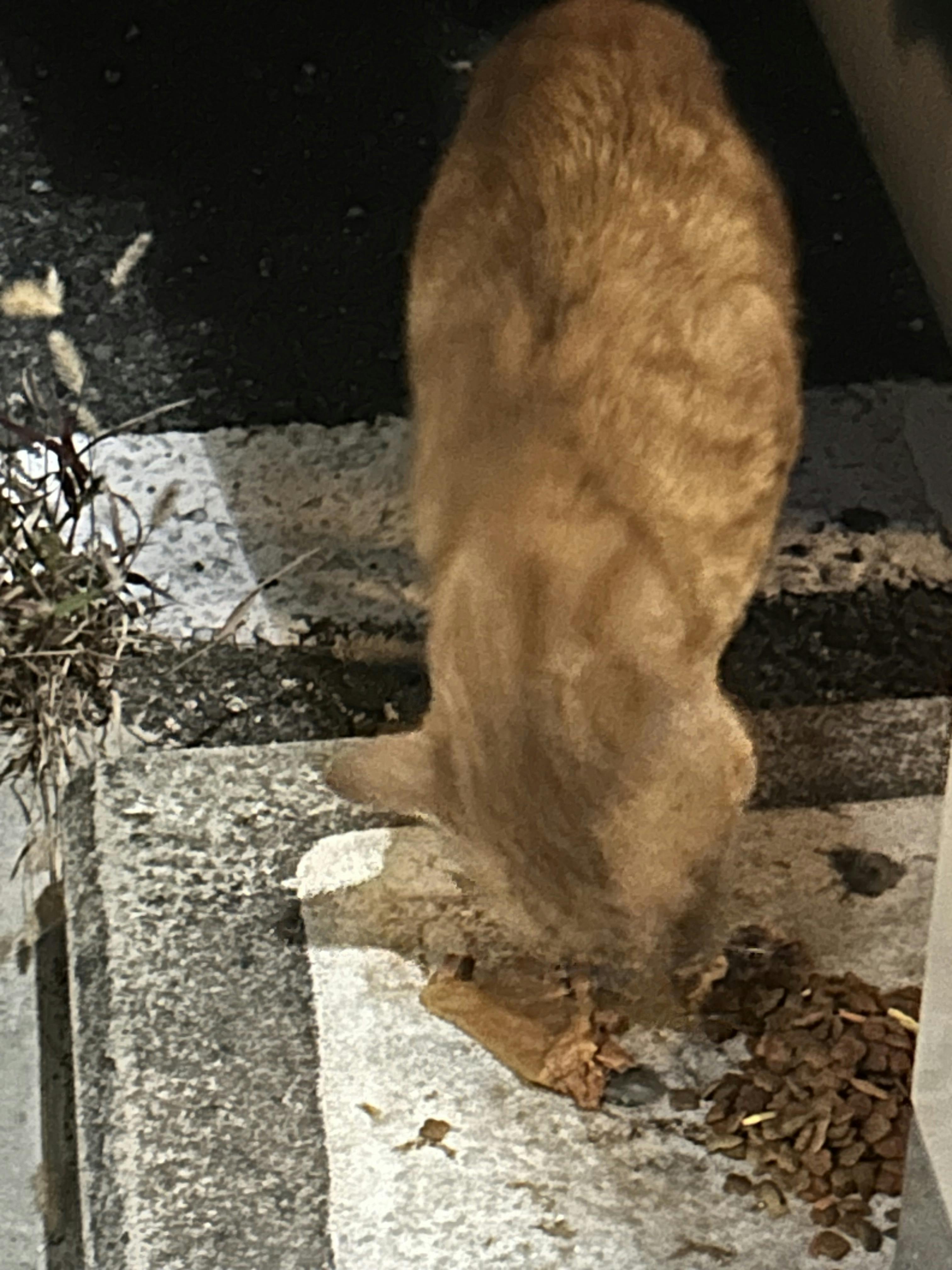 公園チャトラが来てました。三毛猫ちゃんにカリカリ置いたら,ヒョイと,チャトラが現れた!