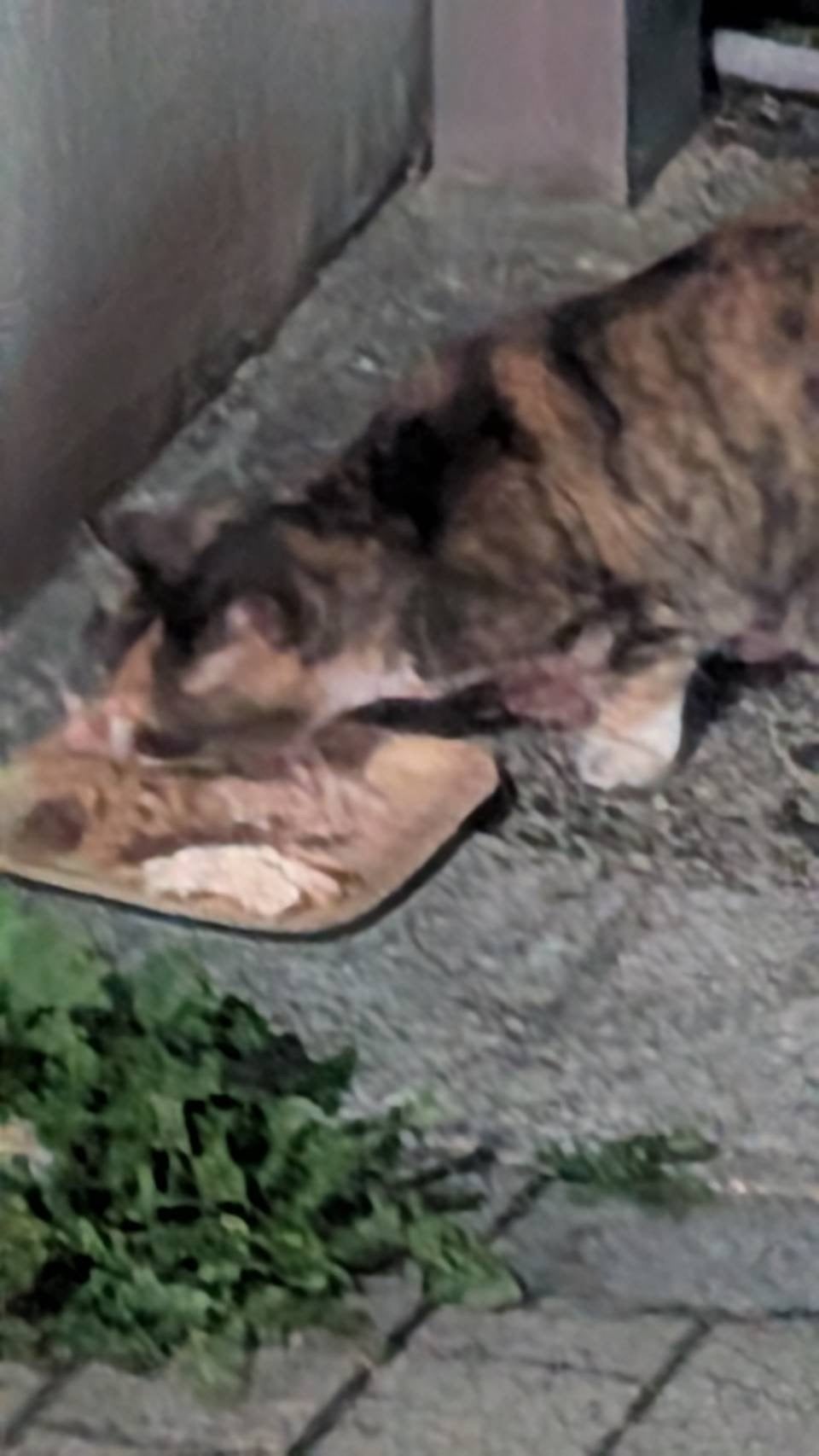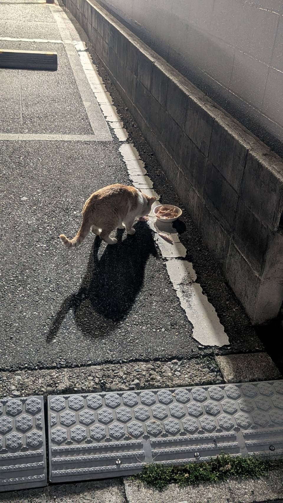 昨夜はアルバイトの方が配ってくれました。猫達は自転車の音で出て来て,しっぽを無くしたハマチ君以外,みんなに会えたようです。