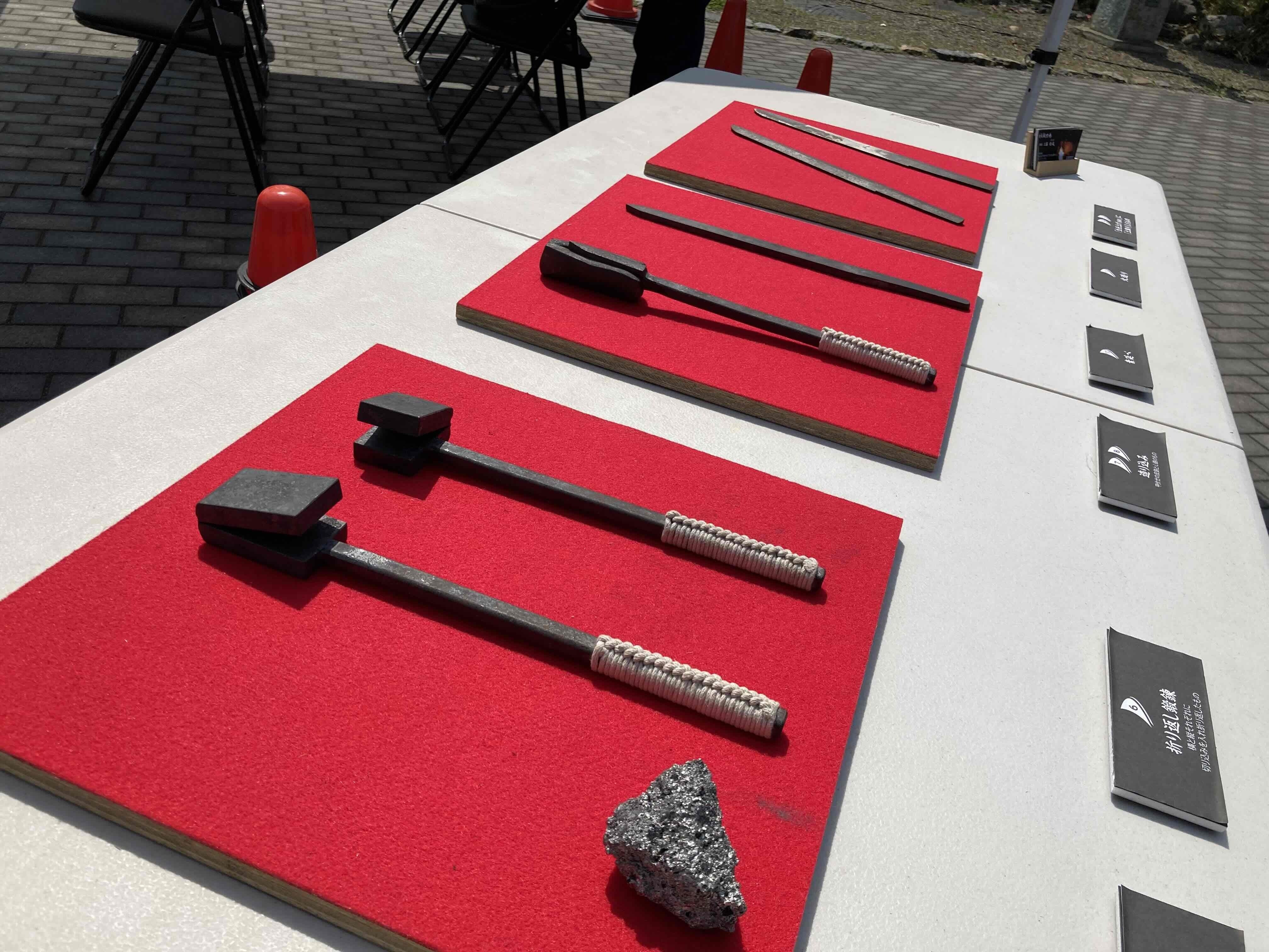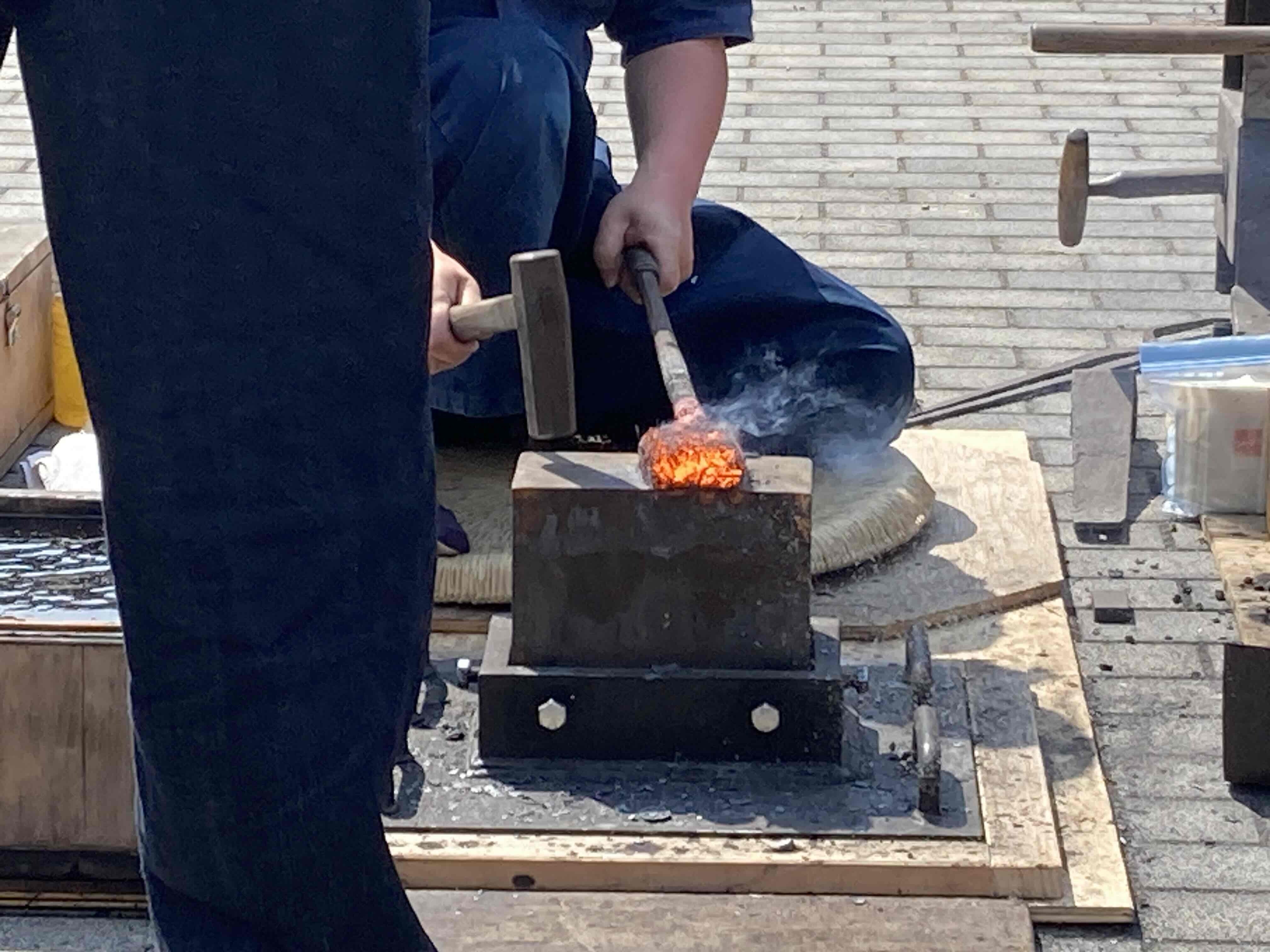 とてもよいお天気。見学席にはテントがありましたが、刀鍛冶さんたちの作業される場はまばゆいお日様の下。可搬式の鞴(ふいご:火力を起こすために風を送る道具)、工藤刀匠手作りの炉や槌が用意されていました。