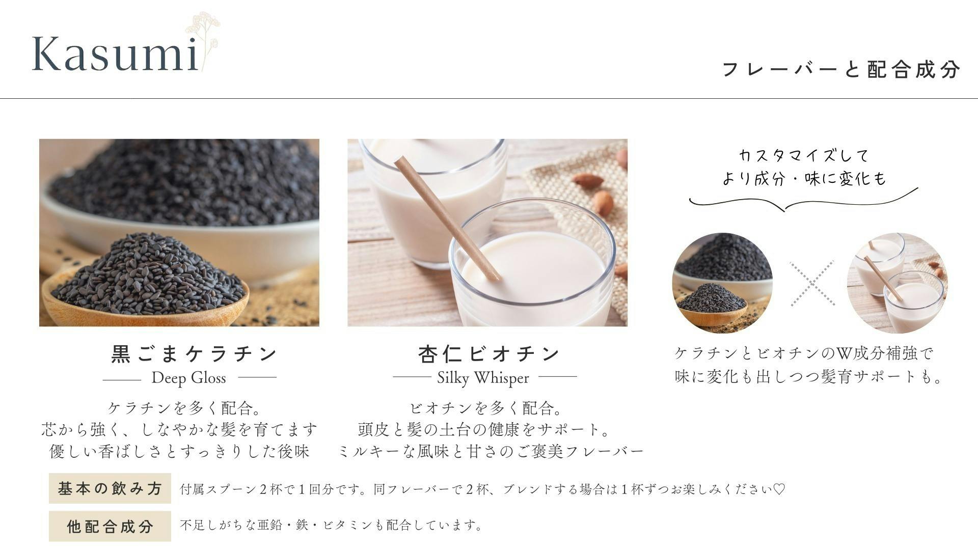 髪の毛の主成分であるケラチンの生成をサポートする成分、頭皮環境を整える成分、そしてストレスに対抗する力を高める成分を独自のバランスで配合します。味のカスタマイズも単純な味変ではなく、それぞれの味に合わせて成分を最適化できる仕組みを構築しています。