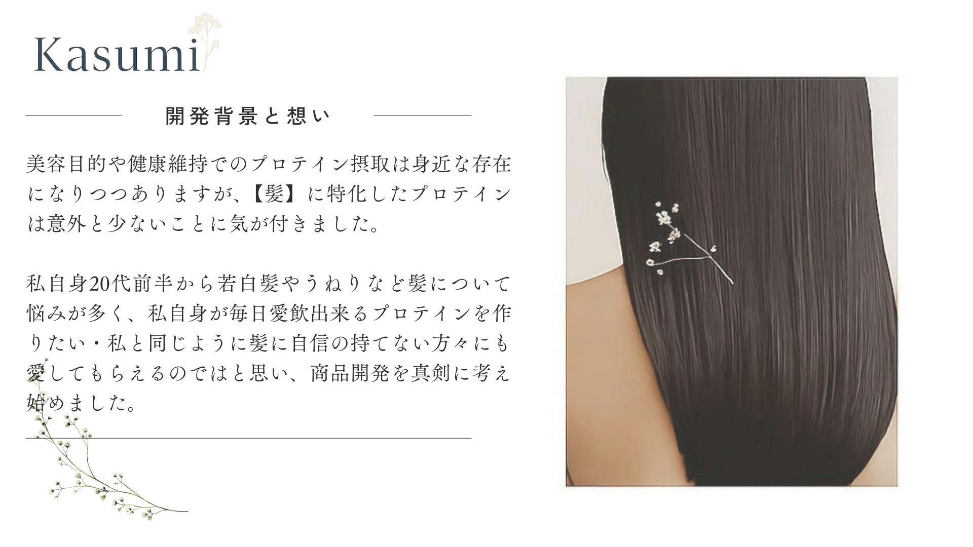 その経験の中で気づいたことがありました。髪の健康と心の健康は密接に関係しているということ、そして現在市場にある多くのプロテインは筋トレや一般的な美容目的のものばかりで、【髪に特化し、なおかつメンタルケアもできる】プロテインはまだあまり見かけないと感じました。