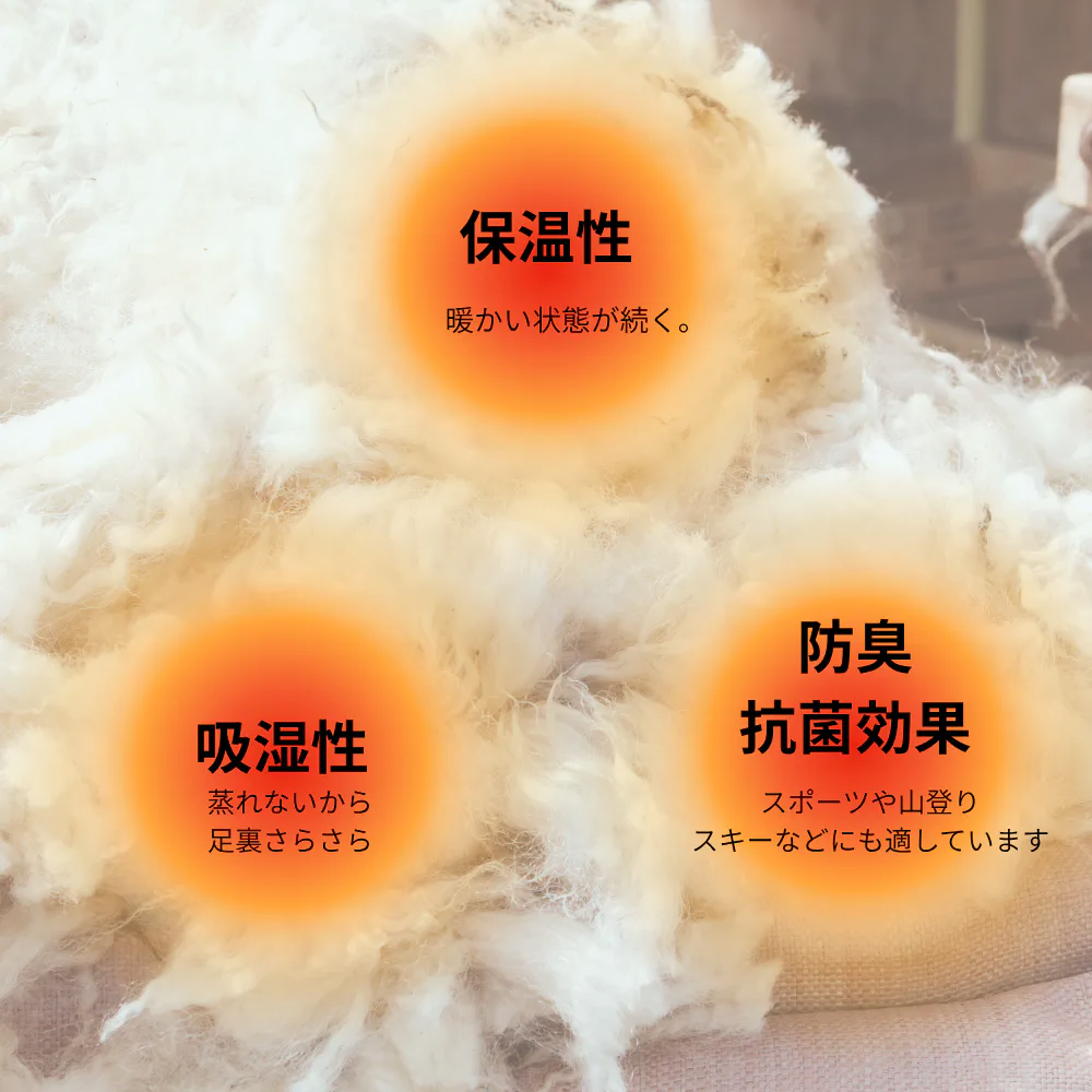 細かく縮れた毛の中に空気を多く含むため、一度履けば暖まった熱が逃げることなく、ぽかぽかと心地よい温かさが続きます。