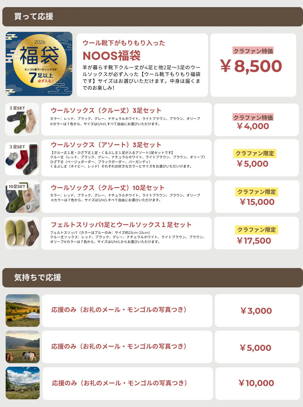 今回のプロジェクトでは、モンゴル産ウール靴下を中心にNOOSの人気商品を、Amazon等のECモールでは販売していない特別なセットでご提供いたします。